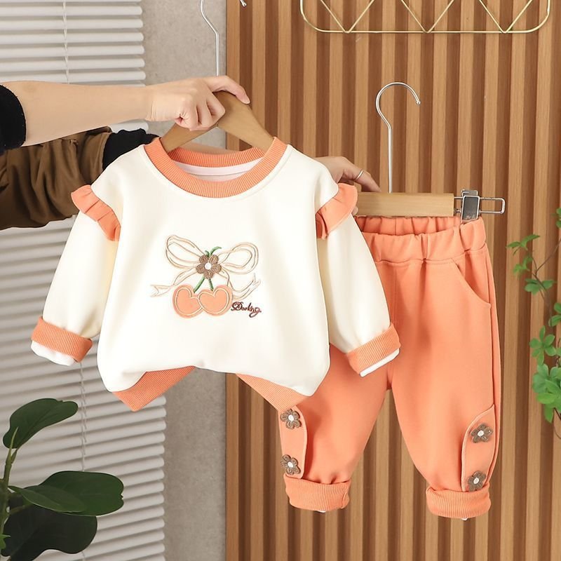 Designed with warm, breathable fabric, this set keeps your baby cozy while allowing easy movement. The ruffle sleeve details, ribbed cuffs, and cute floral button accents on the pants add a charming, playful touch—perfect for everyday wear or casual outings.