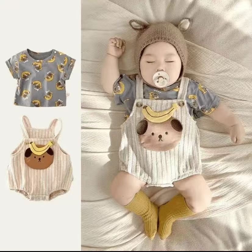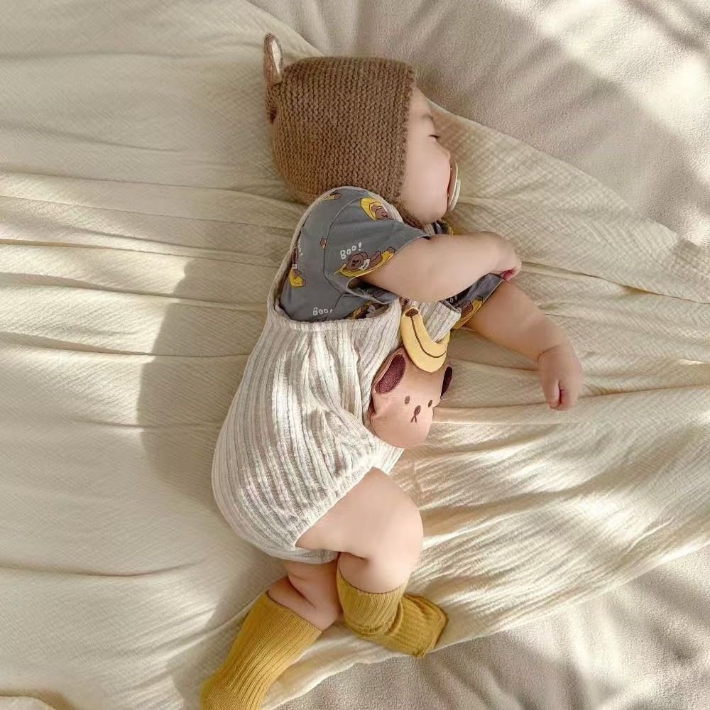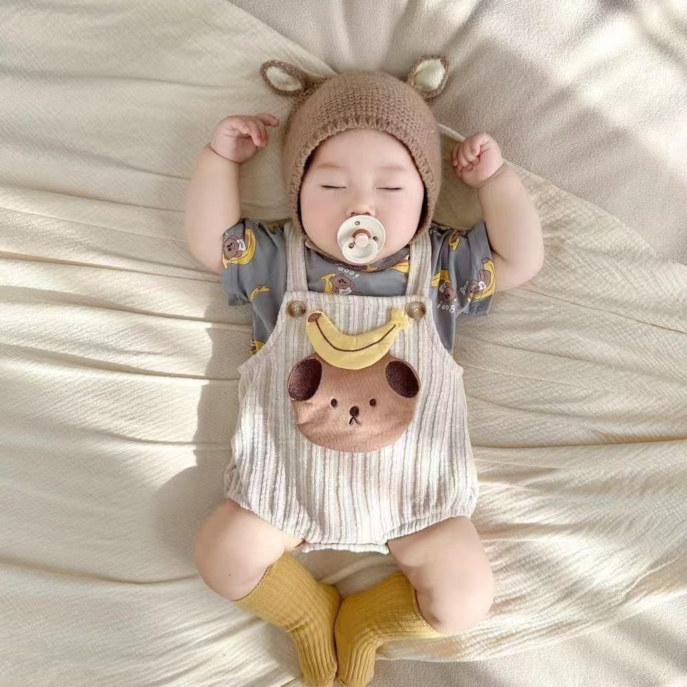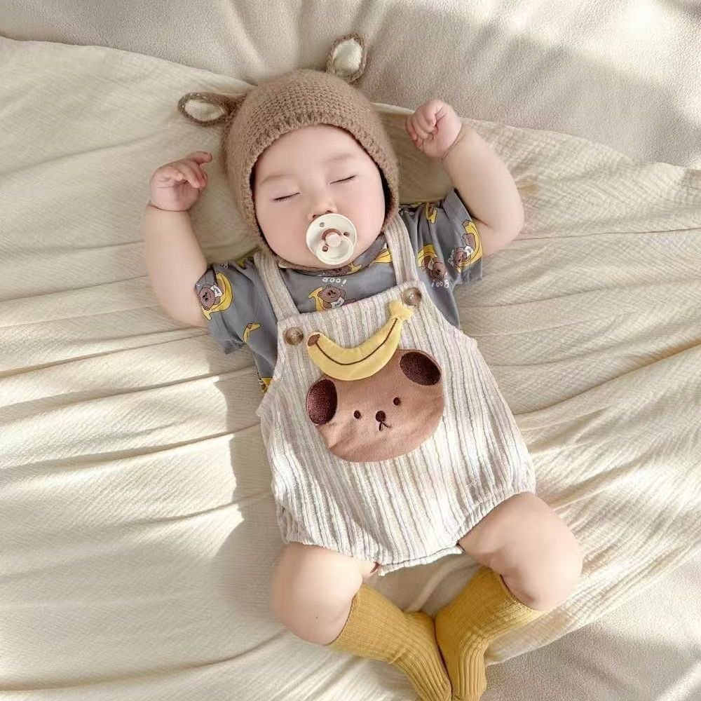 The Banana Bear Cutie Set is an irresistibly adorable outfit designed for ultimate baby comfort and cuteness. Featuring a soft printed tee layered with a cozy bear-face dungaree, this set brings playful charm with its banana detail and teddy design. Made from breathable, baby-friendly fabric, it’s gentle on delicate skin and perfect for naps, playtime, or photoshoots. The matching bear-ear cap and socks complete the look, making this a perfect all-in-one outfit for stylish little ones.