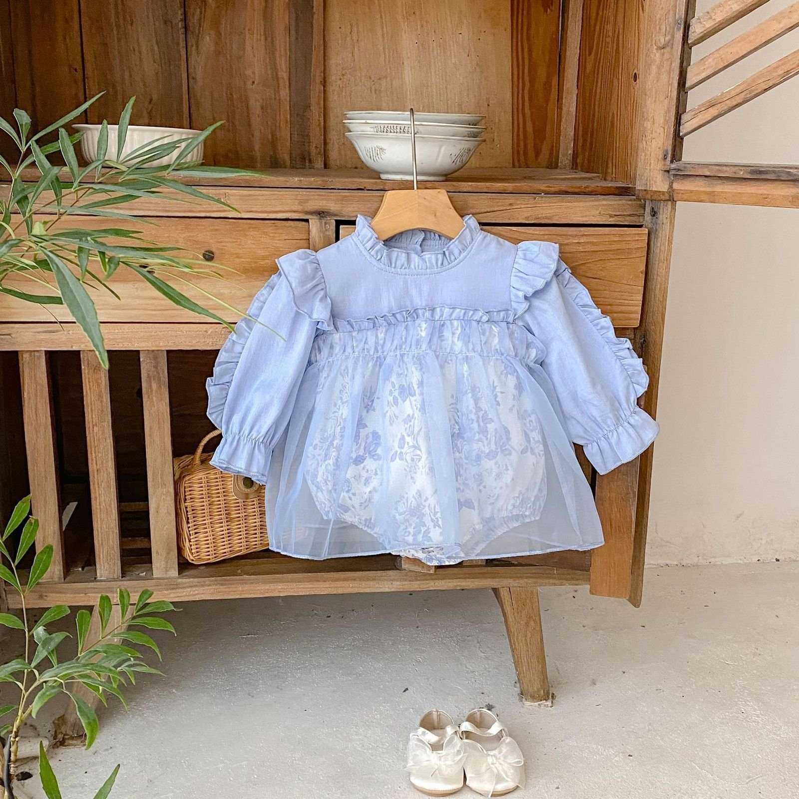 A dreamy and elegant PC set designed for little princess moments. This set features a soft pastel blue long-sleeve top with delicate ruffle details, paired with a floral inner romper and a sheer tulle overlay for a fairy-like finish. Light, breathable, and gentle on baby skin, it’s perfect for special occasions, photoshoots, or stylish everyday wear. Sweet, graceful, and timeless