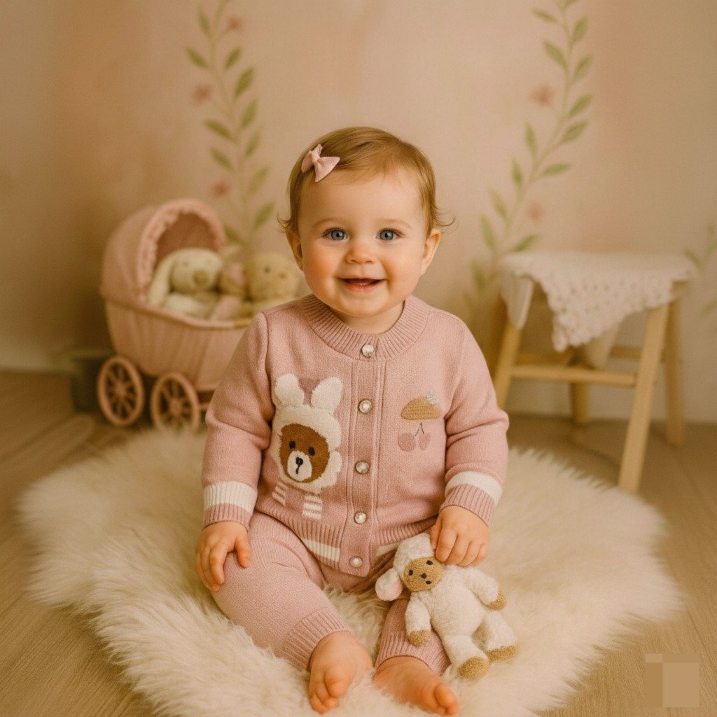 This outfit features a soft blush-pink knit cardigan with adorable bunny-and-bear illustrations on the front, accented by delicate buttons and cozy ribbed cuffs.while the overall palette keeps everything soft and dreamy. The vibe is cozy, nursery-cute, and perfect for a classic baby portrait or lounging-in-style moment.