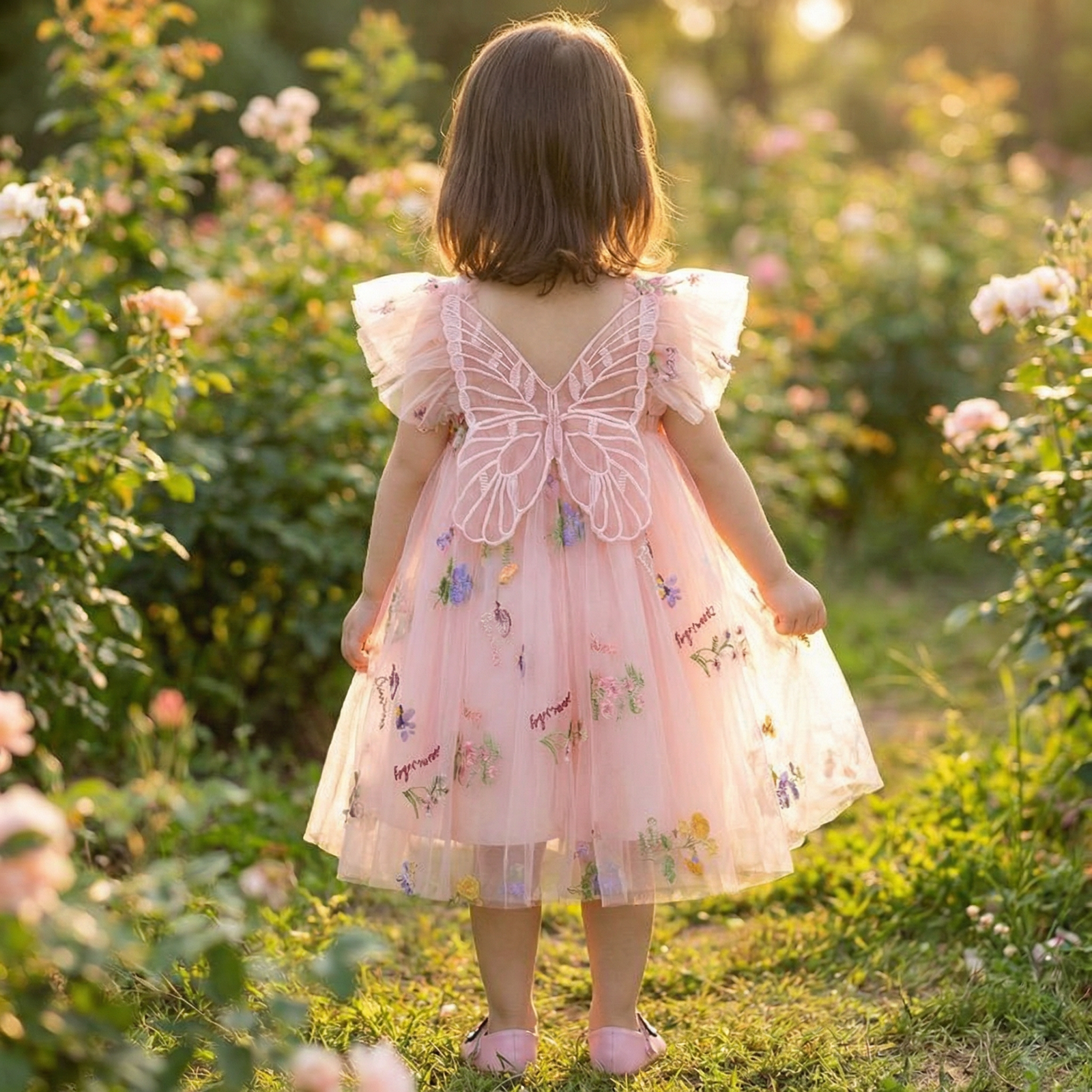 The flowy tulle skirt is delicately embroidered with colorful floral details, creating a light, airy look that’s perfect for special occasions. The flutter sleeves enhance the fairy-like charm, making this dress a true showstopper