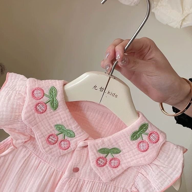 A soft and airy blush-pink baby romper made from lightweight crinkled cotton for all-day comfort. It features a sweet ruffled collar embroidered with tiny cherry motifs, flutter sleeves, and delicate front buttons for easy dressing. Snap closures at the bottom make changes simple, while the gentle pastel tone and charming embroidery give it a fresh, innocent, and cozy look—perfect for warm days or adorable photos.