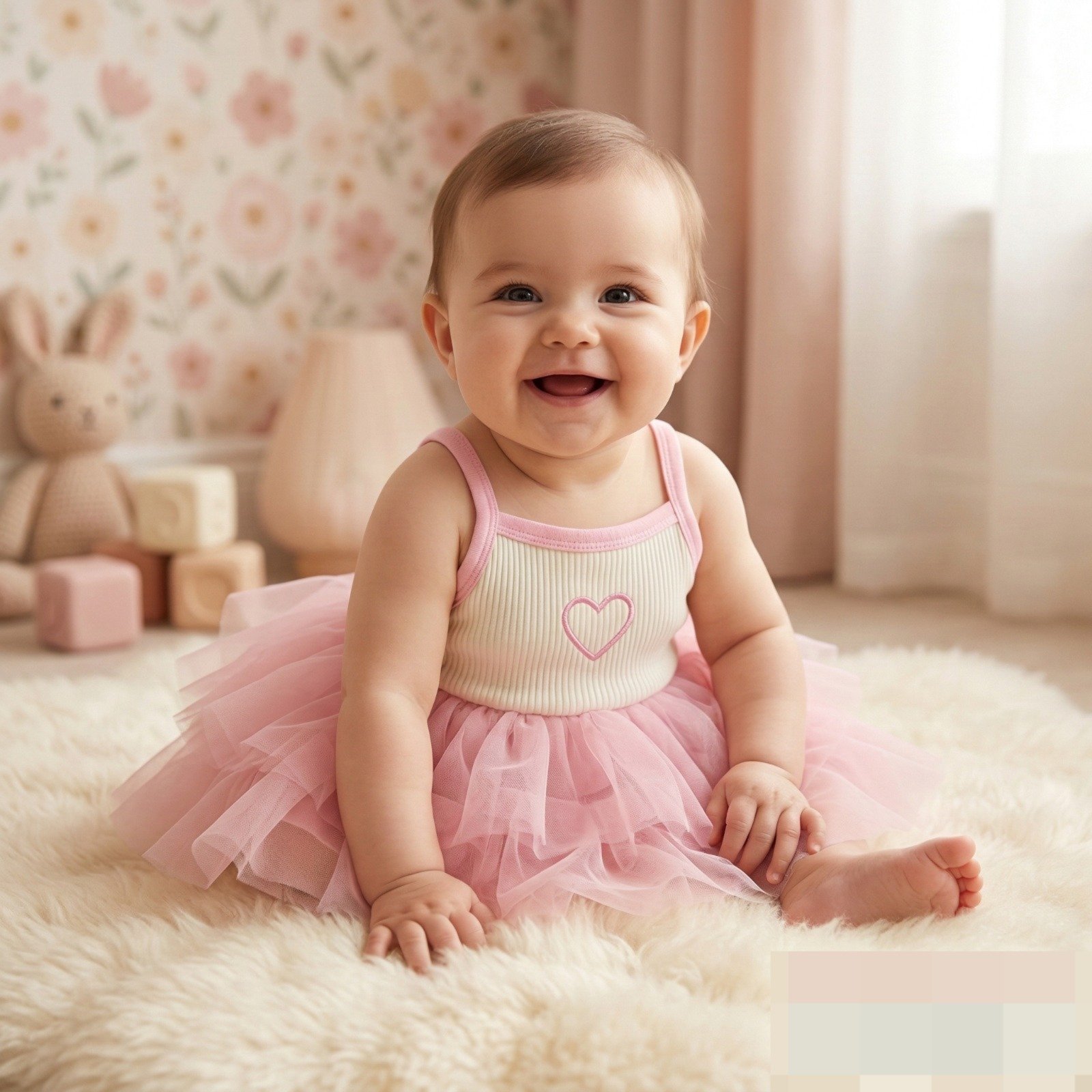A delicate blush pink dress designed with slim spaghetti straps trimmed in soft rose binding for a sweet, refined touch. The bodice features a subtle ivory ribbed panel accented with a minimalist embroidered heart at the center, adding understated charm. Flowing from the waist is a voluminous layered tulle skirt in matching blush, crafted with cascading ruffles that create a dreamy, cloud-like silhouette full of movement. Light, airy, and beautifully feminine, this dress is perfect for birthdays, celebrations, and magical twirl-worthy moments.