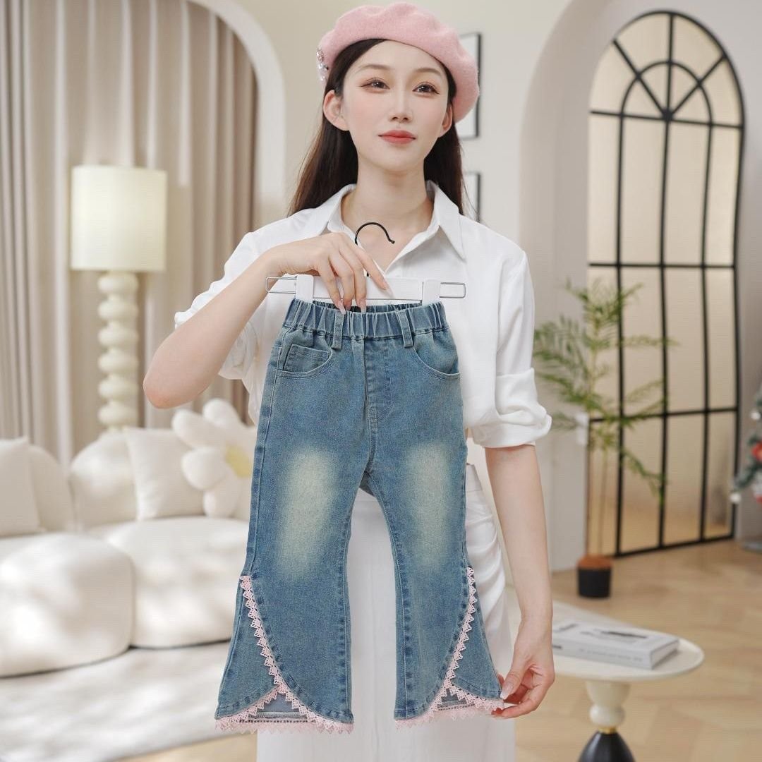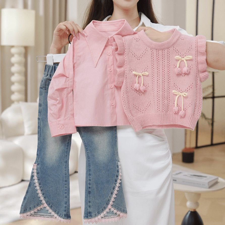This adorable kids’ co-ord set features a soft blush pink knitted vest layered over a matching collared shirt with puffed sleeves, creating a sweet and elegant look. Delicate bow and floral appliqué details add a charming touch, while the breathable knit keeps it cozy and comfortable. Paired with stylish denim pants finished with lace-trim detailing at the hem, this outfit blends cuteness with everyday elegance—perfect for outings, casual parties, or special occasions.