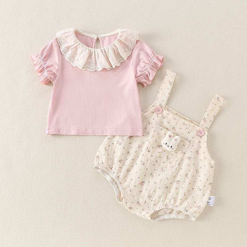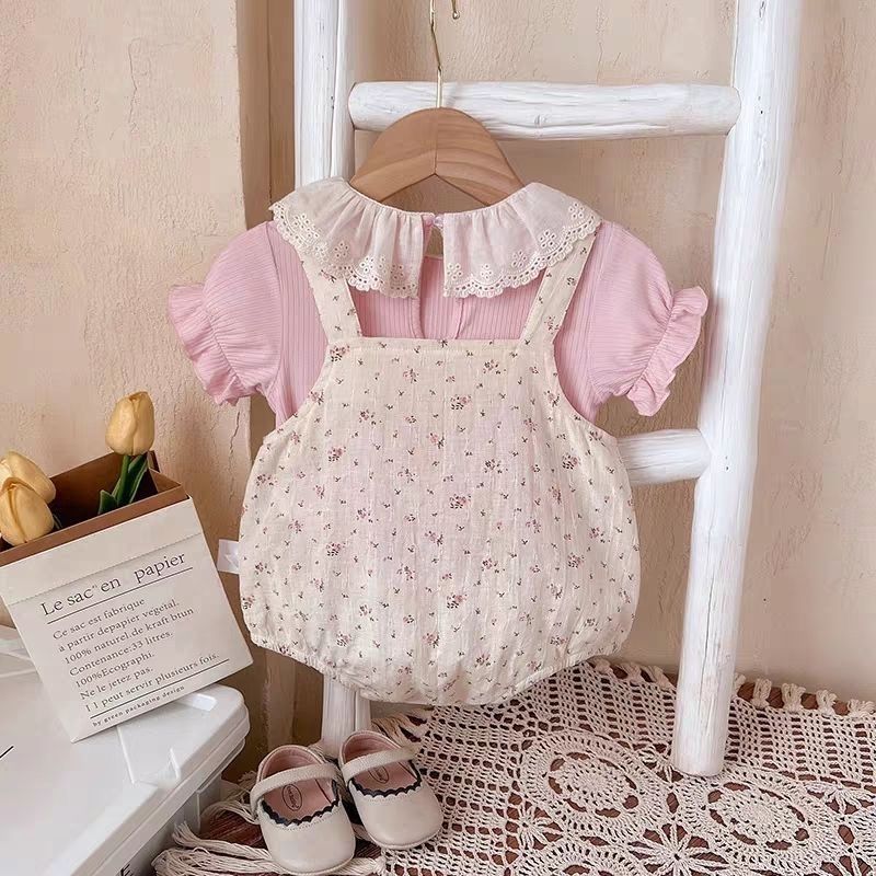 A soft pink puff-sleeve top with a frilly lace collar layered under a cream floral bubble romper, finished with tiny buttons and an adorable bunny pocket. This sweet one-piece gives cozy comfort with a dainty, storybook charm for everyday wear or cute photos.