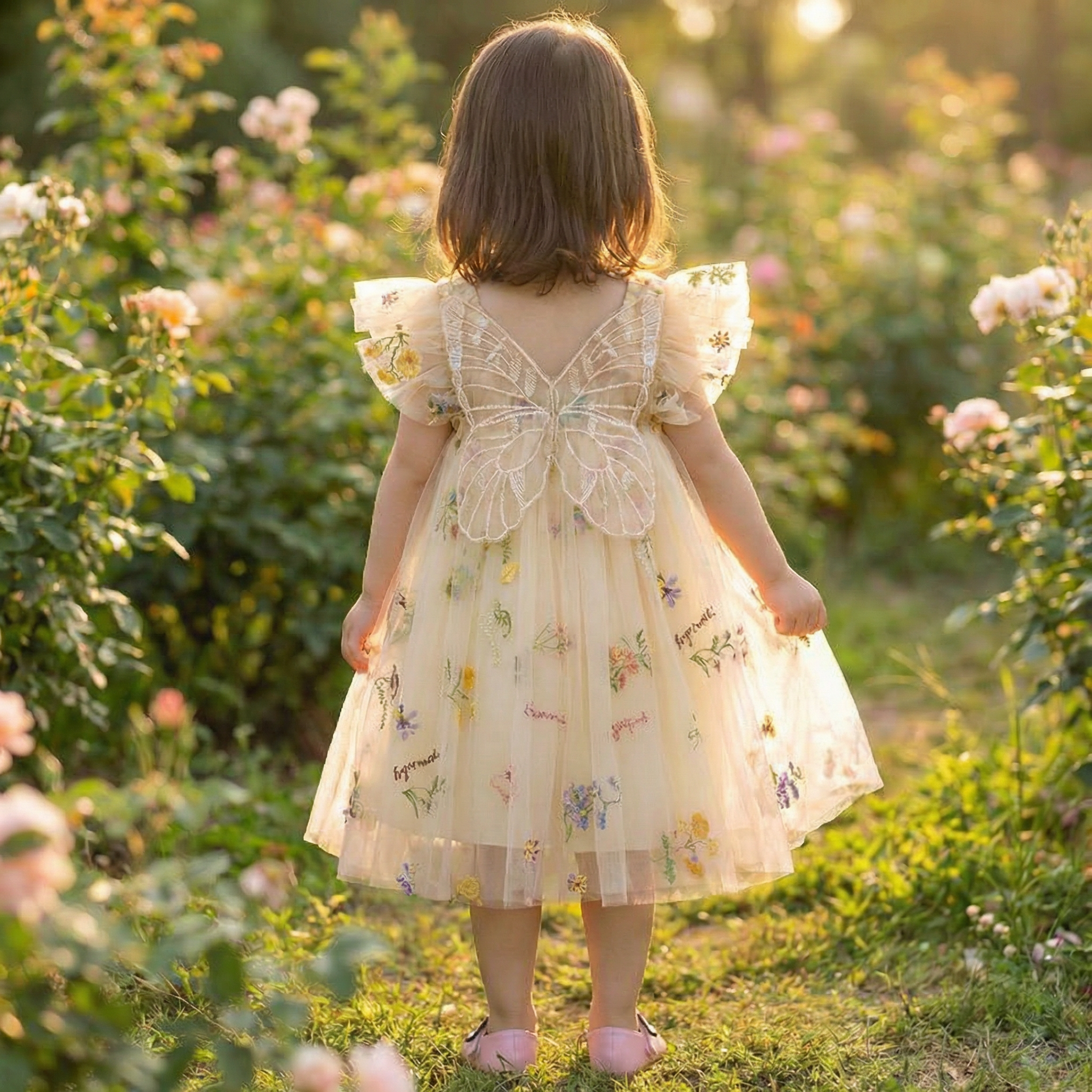 A dreamy pastel yellow tulle dress with a statement butterfly wing back and delicate embroidered flowers scattered all over the skirt. Soft ruffled sleeves and a floaty silhouette make this the perfect magical outfit for birthdays, photoshoots, and pretend fairy adventures.