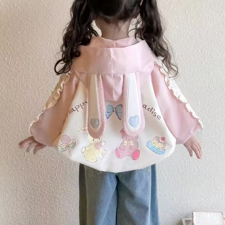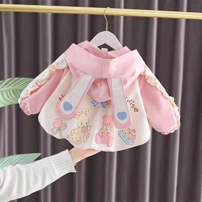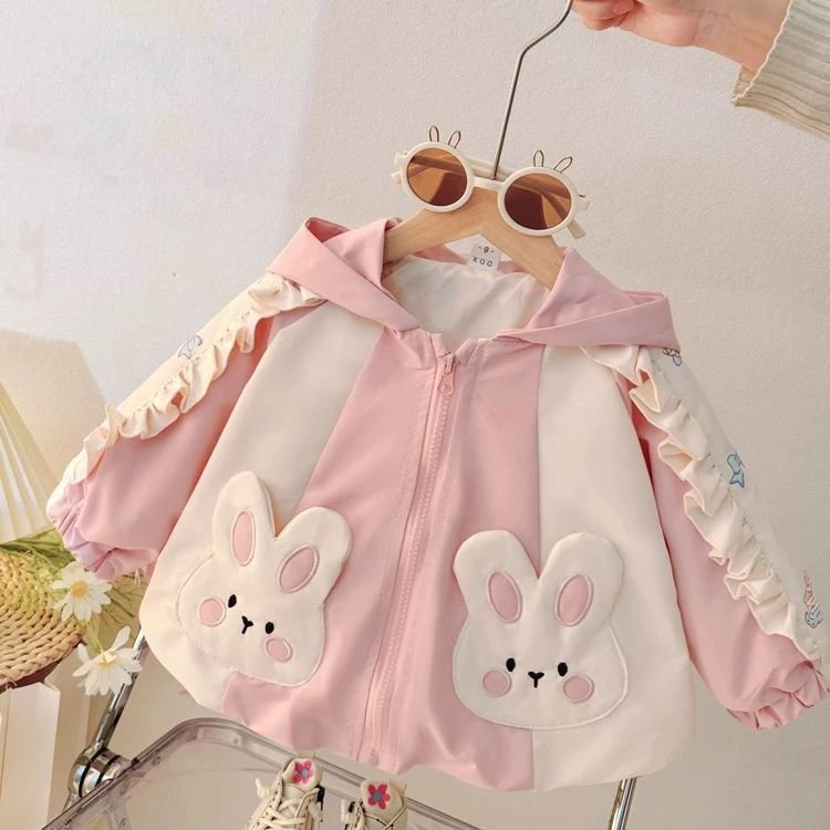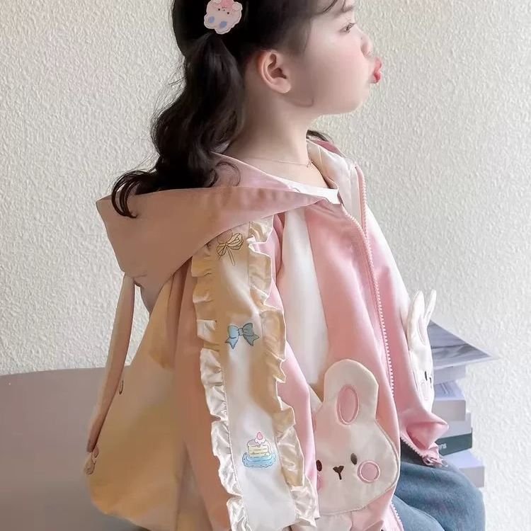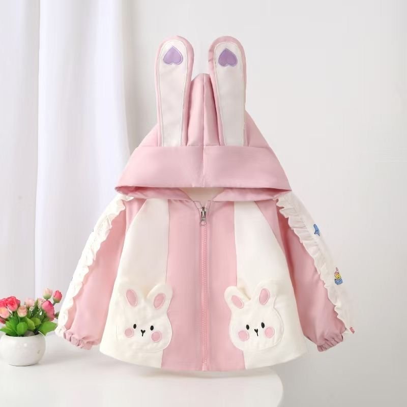 This adorable kids’ jacket features a soft pastel pink and white color palette with a charming bunny theme. Designed with a cozy hood topped with long bunny ears and heart-shaped details, it adds a playful and cute touch kids will love. The front showcases two bunny face pockets with embroidered details, making it both fun and functional.