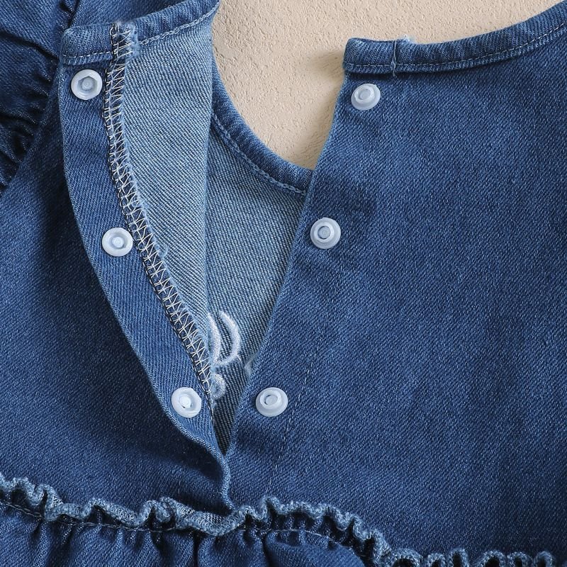 A charming long-sleeve denim romper crafted in a soft, medium-wash blue for a sweet yet stylish look. The bodice features delicate ruffle accents at the shoulders and an embroidered “Daddy’s Girl” script across the chest for a heartfelt touch. Layered double ruffles flow around the waist, adorned with tiny colorful star embellishments that add a playful sparkle. The sleeves are finished with gentle elastic cuffs, while the bubble-style bottom includes snap closures for easy changes. Cute, cozy, and full of personality, this romper is perfect for everyday moments with a little extra love.