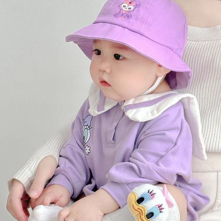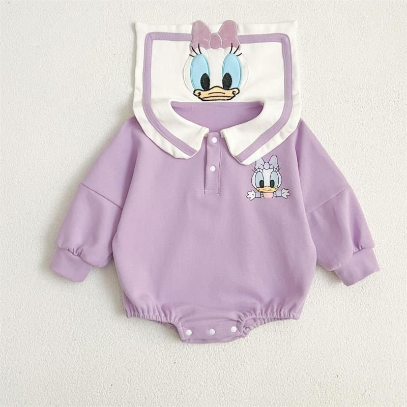 A charming lavender baby romper designed with a soft white sailor-style collar and cute cartoon duck detailing for a playful touch. The outfit is paired with a matching lavender bucket hat featuring an embroidered character and cozy duck-themed socks, creating a perfectly coordinated look. The gentle pastel color and comfy fabric give this set a sweet, calming vibe—ideal for outings, lounging, or adorable photo moments.