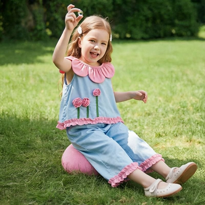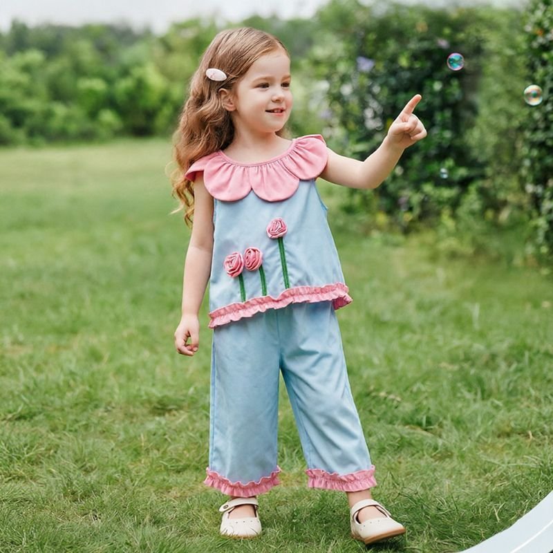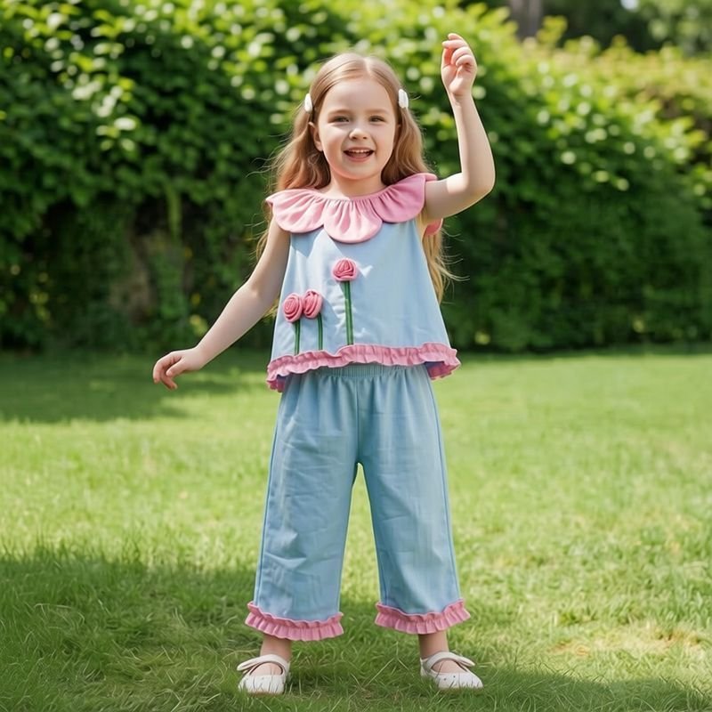 A playful and fresh two-piece outfit featuring a soft blue sleeveless top with a wide pink ruffle collar and cute floral appliqué details. Paired with matching blue pants trimmed with pink ruffles at the hem, this set gives a cheerful, garden-inspired vibe. Light, comfy, and full of charm, it’s perfect for sunny days and outdoor fun.