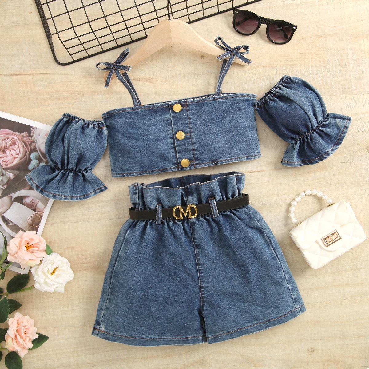 A trendy and stylish girls’ denim co-ord set designed to stand out. This fashionable outfit features a sleeveless denim crop top with front button detailing and adjustable tie-up straps, paired with matching high-waist denim shorts. The look is elevated with detachable puff sleeves and a chic belt, adding a modern and playful touch. Made from soft, breathable denim fabric, this set is perfect for parties, outings, vacations, and stylish everyday wear.