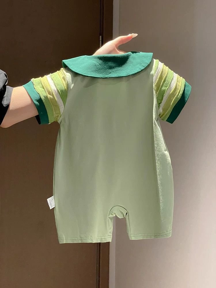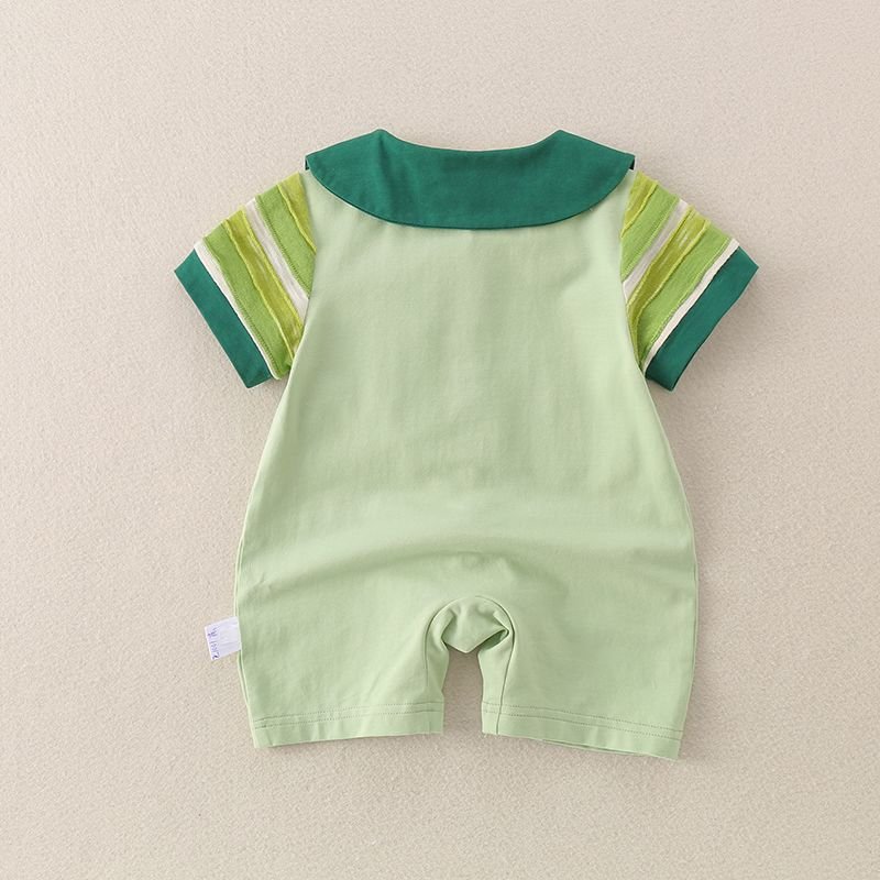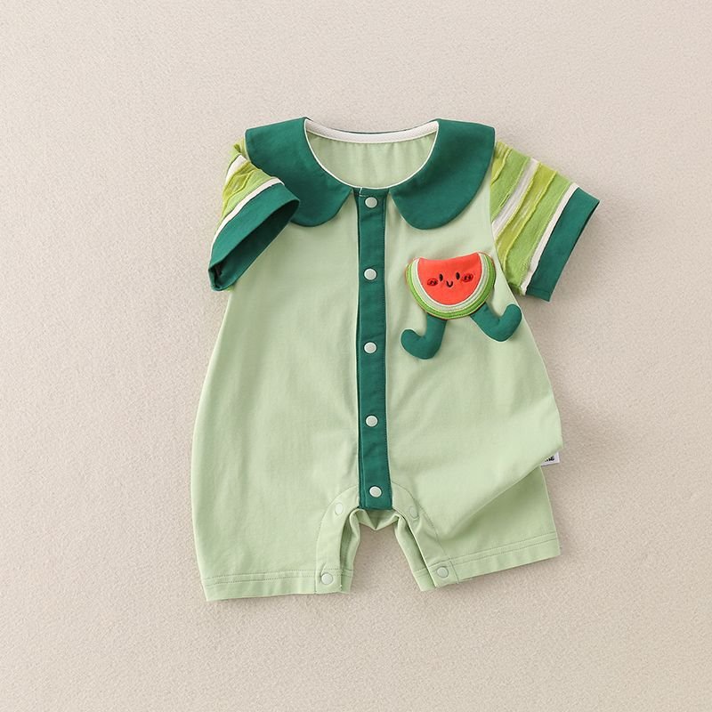 The Happy Watermelon Baby Romper is a fresh and playful outfit designed for everyday comfort. Featuring a soft pastel green base with a cute smiling watermelon patch, this romper adds a fun fruity touch to your baby’s wardrobe. The contrast Peter Pan collar and striped sleeves give it a stylish, classic look, while the front snap buttons and bottom snaps make dressing and diaper changes quick and easy.