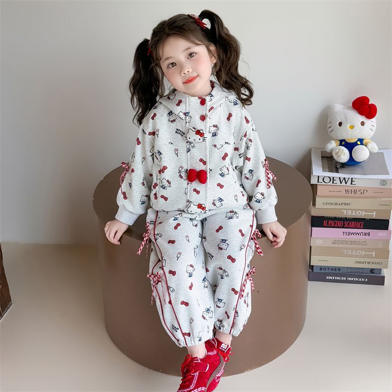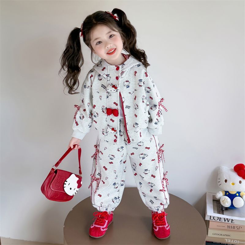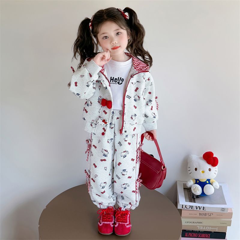 A delightful three-year-old girl models a cozy grey two-piece set featuring an all-over playful print and charming red accents. The zip-up hoodie is detailed with a cute bow at the front and a soft-lined hood, while the matching jogger pants offer a relaxed, comfortable fit with sweet bow ties at the sides. Styled with white sneakers and set against a clean, softly lit studio background, this professional photoshoot highlights a perfect blend of comfort and cuteness—ideal for everyday wear, playtime, and premium kidswear collections.