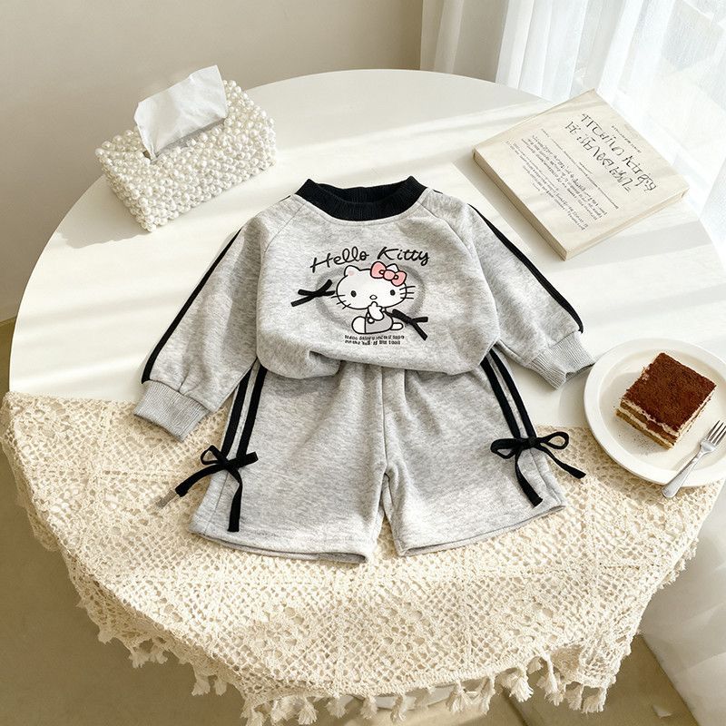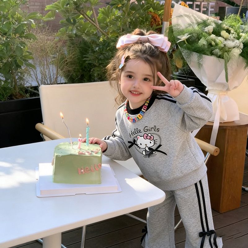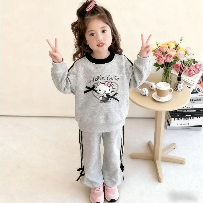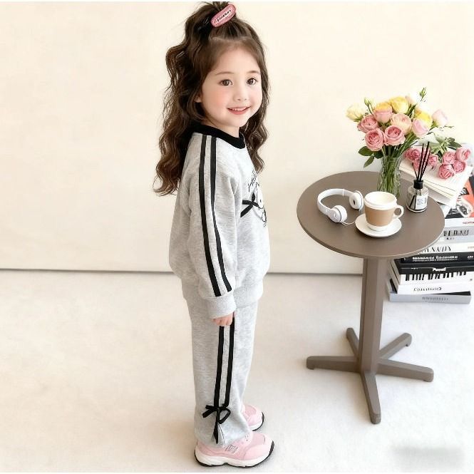 A delightful three-year-old girl models a cozy grey two-piece set featuring an all-over playful print and charming red accents. The zip-up hoodie is detailed with a cute bow at the front and a soft-lined hood, while the matching jogger pants offer a relaxed, comfortable fit with sweet bow ties at the sides. Styled with white sneakers and set against a clean, softly lit studio background, this professional photoshoot highlights a perfect blend of comfort and cuteness—ideal for everyday wear, playtime, and premium kidswear collections.