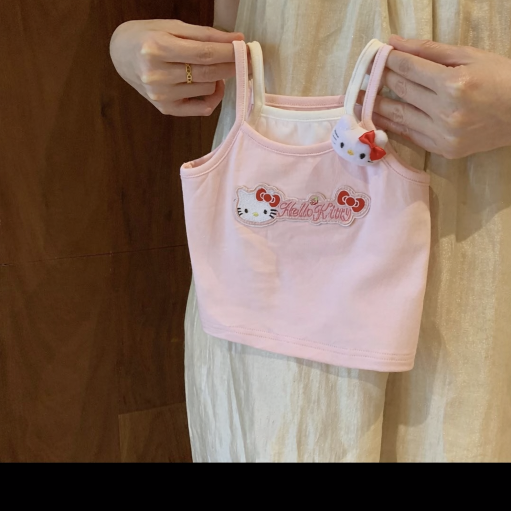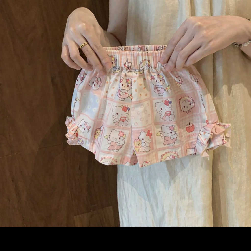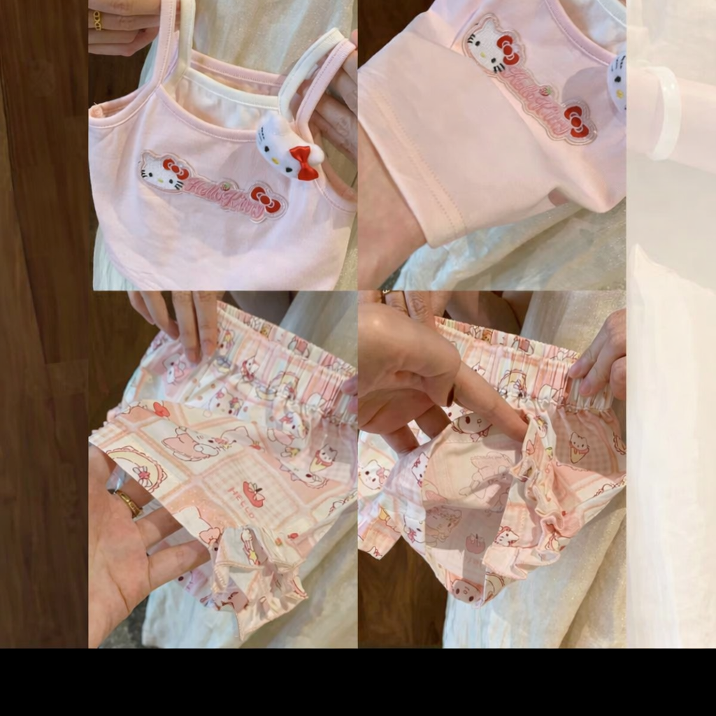 An adorable two-piece set in soft pastel pink, featuring a sleeveless cami top with delicate shoulder straps and a subtle ruffle detail at the neckline. The front is decorated with a charming Hello Kitty graphic and logo applique, complemented by a tiny 3D Hello Kitty accent near the strap for extra cuteness. Paired with matching elastic-waist shorts adorned in an all-over Hello Kitty patchwork print, the design includes gentle ruffle trim at the hem for a playful finish. Sweet, comfy, and full of kawaii charm, this set is perfect for cozy days, sleepovers, and stylish lounging.