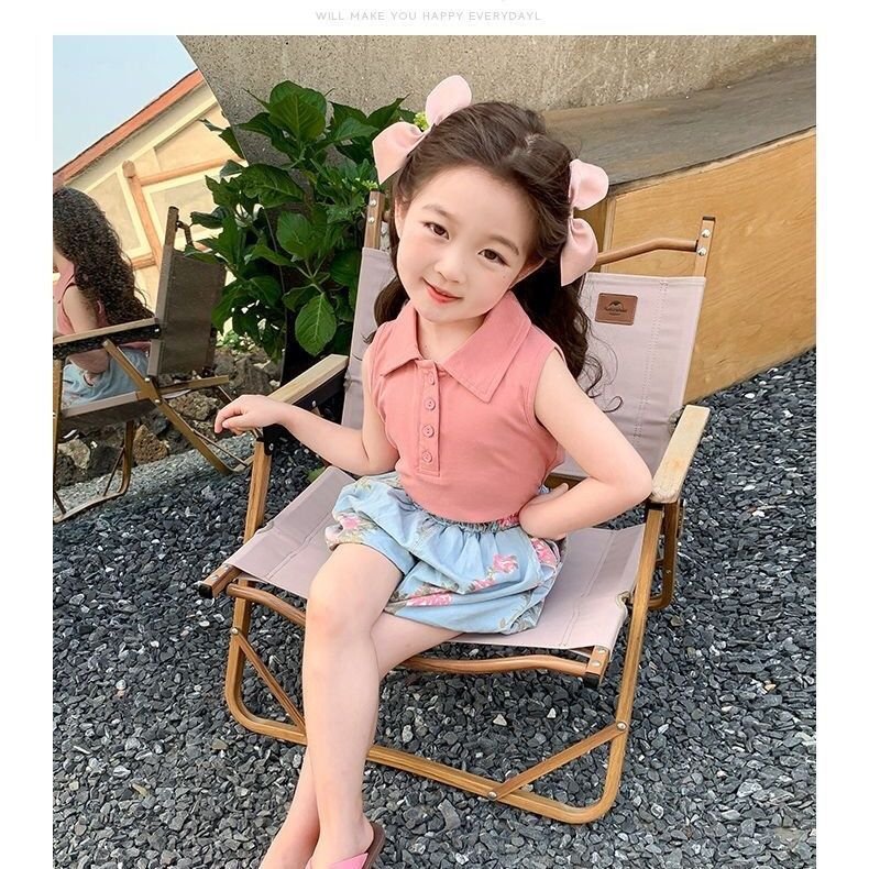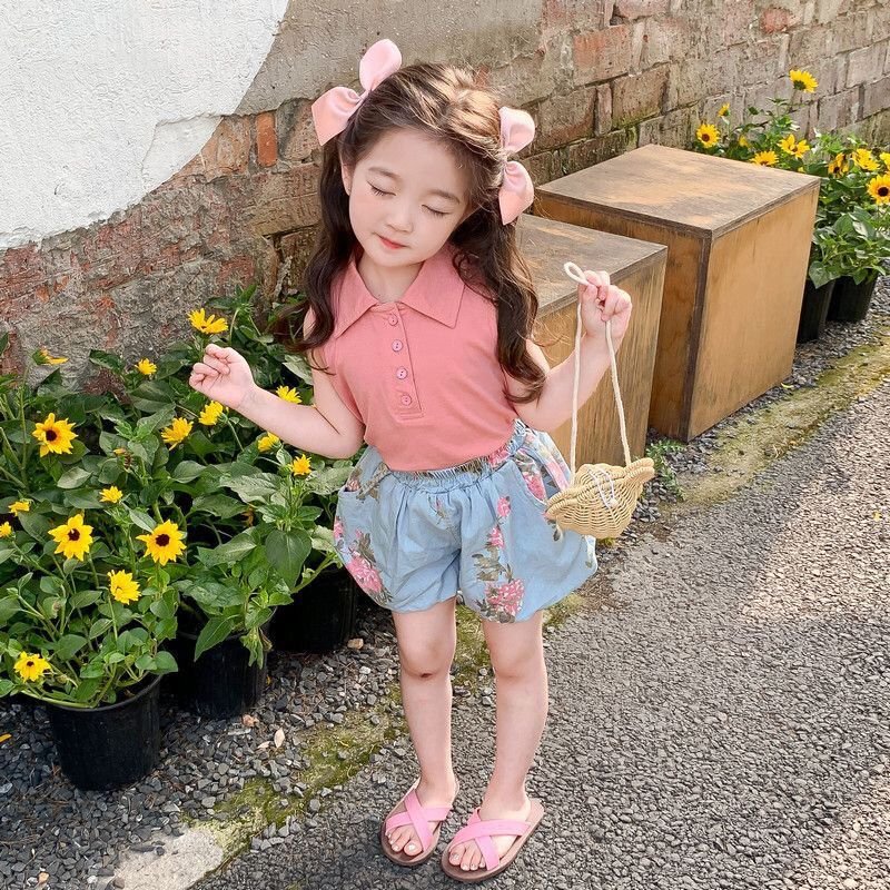 A breezy and stylish two-piece outfit featuring a sleeveless blush-pink collared top with front buttons, paired with soft blue floral shorts designed in a flowy, skirt-like silhouette. The mix of gentle pink and muted denim-blue florals gives it a fresh summer feel, while the lightweight fabrics keep it comfy and airy. Perfect for warm days, this set has a sweet, playful charm with a touch of casual elegance.