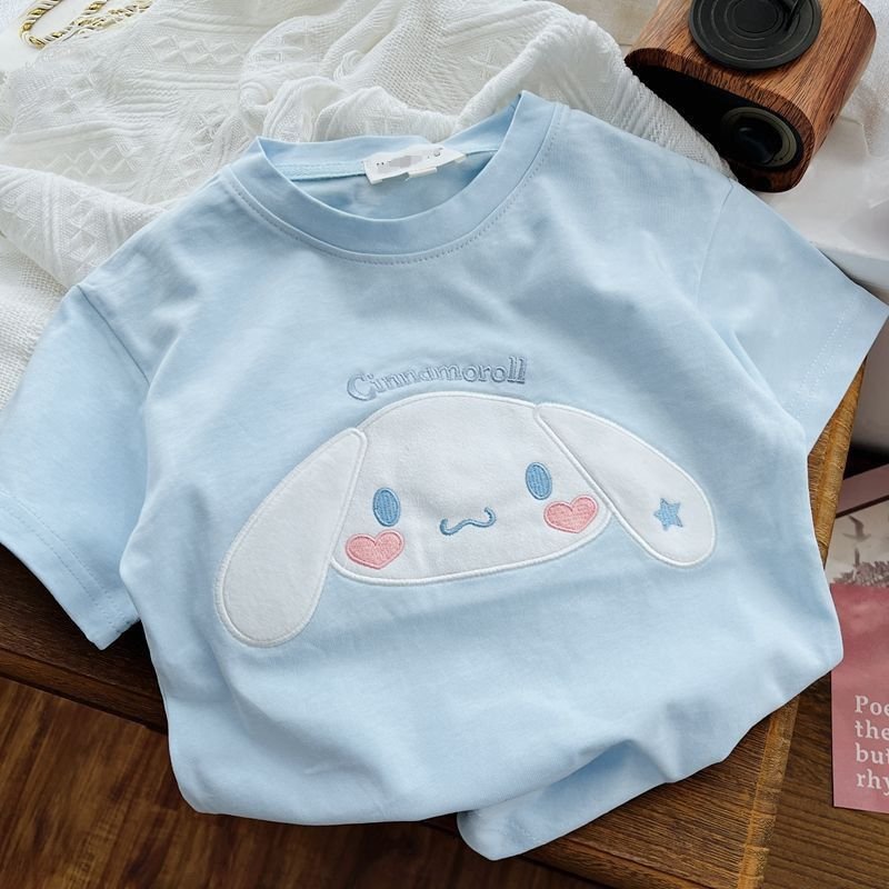This adorable light blue T-shirt features a sweet embroidered Cinnamoroll design on the front Made from soft, breathable cotton fabric, it feels gentle on the skin and is perfect for everyday comfort. The cute face embroidery with pastel heart details adds a playful and charming touch