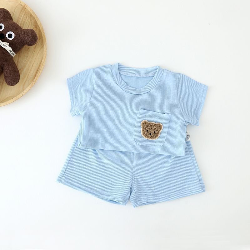 The Little Bear Summer Co-Ord Set is an adorable and comfy outfit designed for everyday cuteness Made in a soft ribbed fabric, this light blue set includes a short-sleeve top and matching shorts for a relaxed, breathable fit.