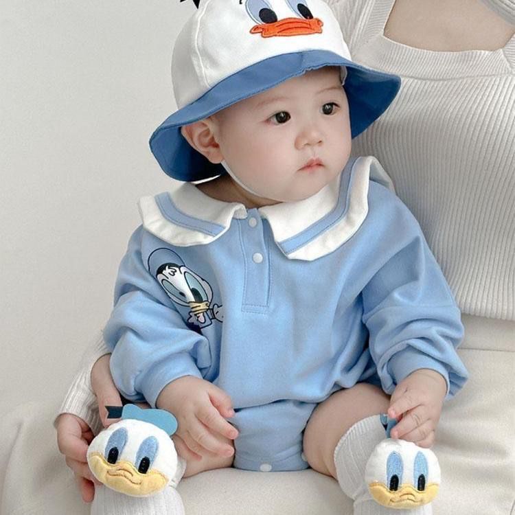 An adorable pastel blue baby romper styled with a soft sailor-style white collar and cute cartoon duck detailing on the chest. The outfit is paired with a matching bucket hat featuring a duck face design and cozy duck-themed socks, creating a perfectly coordinated look. Made from comfy, breathable fabric, this set gives a playful, cheerful vibe while keeping the baby snug and stylish—ideal for outings, playtime, or cute photo moments.