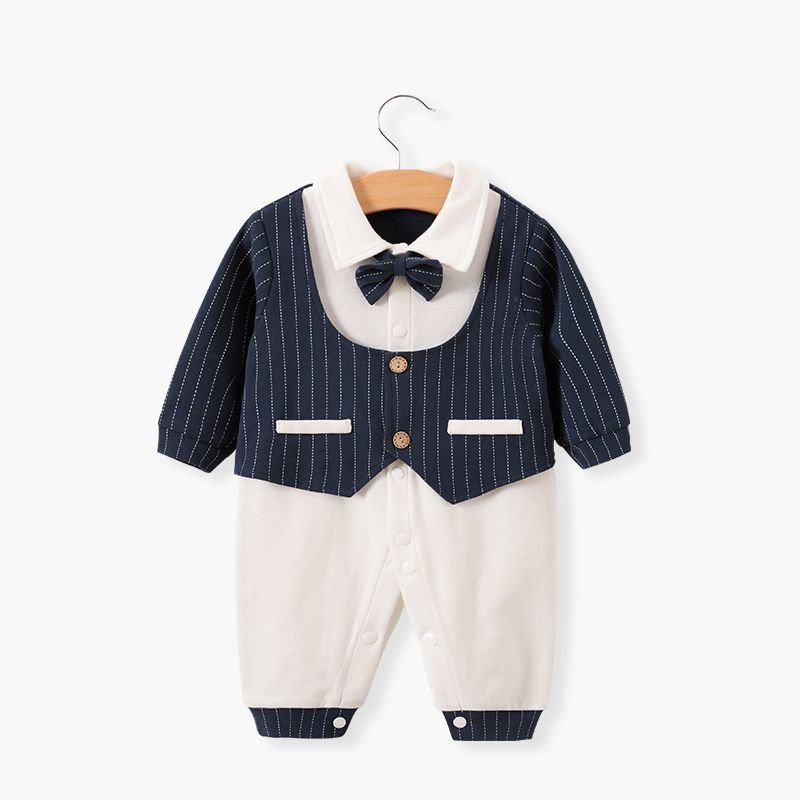 A dapper one‑piece romper designed like a tiny tux, featuring a navy pinstriped jacket with matching bow tie over a crisp white base. Wooden buttons, faux pockets, and cuffed ankles complete the “mini gentleman” look—perfect for birthdays, weddings, and all special family occasions.