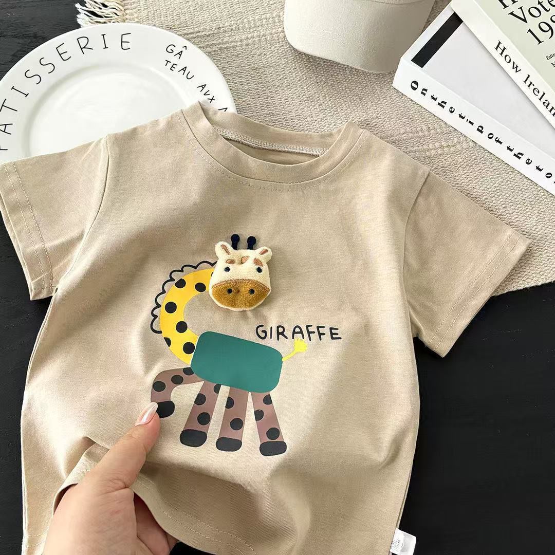 The Little Giraffe Cotton Tee is a playful and comfy everyday essential for your little one Made from soft, breathable cotton fabric, this short-sleeve t-shirt features an adorable giraffe print with a 3D plush giraffe detail, adding a fun and cute touch kids will love.