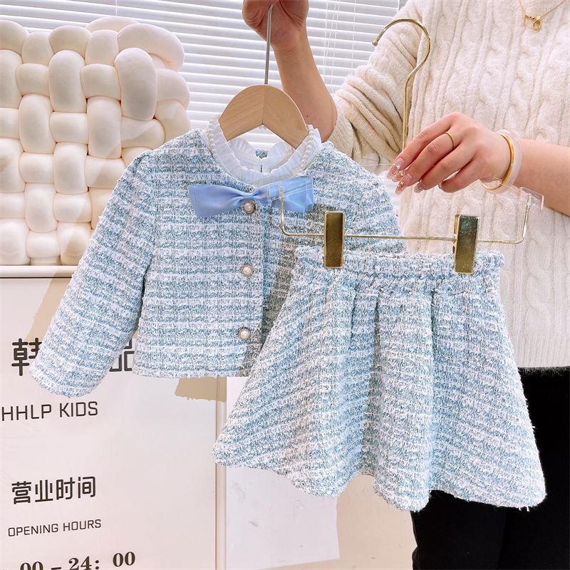 A classy two-piece outfit crafted in a soft blue tweed fabric, featuring a cropped jacket and a matching skirt. The jacket is detailed with elegant pearl buttons, a satin bow accent, and a delicate pearl neckline that adds a refined, vintage-inspired charm. The matching skirt completes the look with a graceful silhouette, making this outfit perfect for special occasions, parties, or a polished formal style.