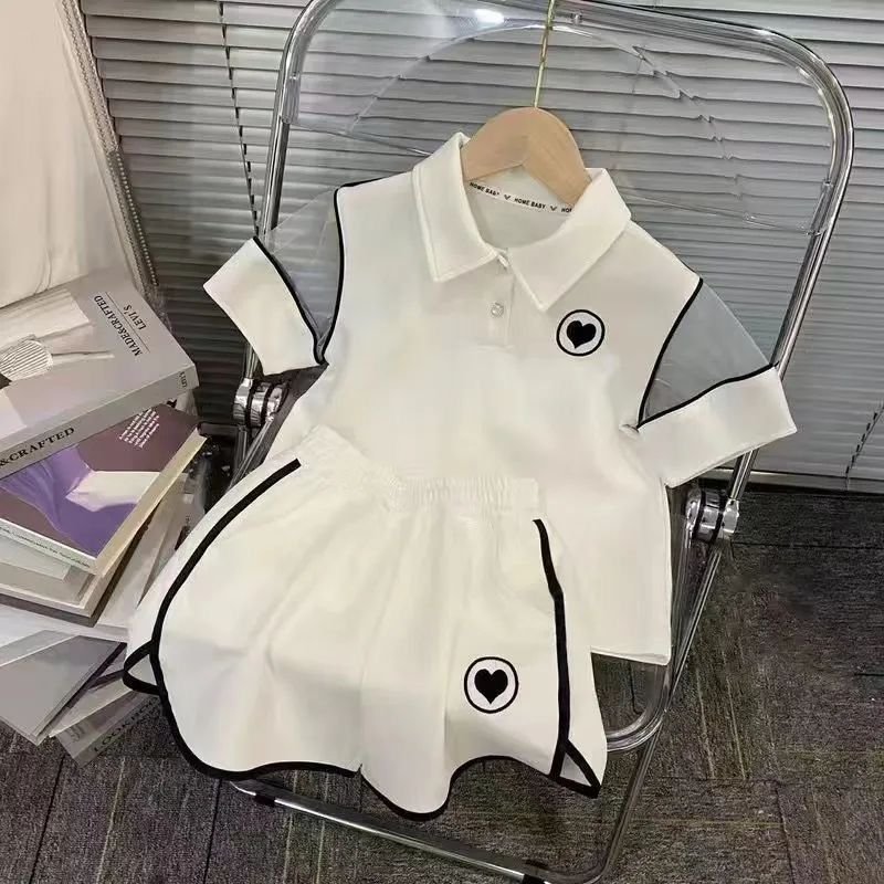 A clean and classy white two-piece outfit featuring a collared polo-style top with sporty black piping and a cute heart detail on the chest. Paired with a flowy skirt trimmed in matching black accents and a subtle heart design, this set gives off a chic sporty vibe with a soft, girly touch. Perfect for a polished casual look or a preppy aesthetic.