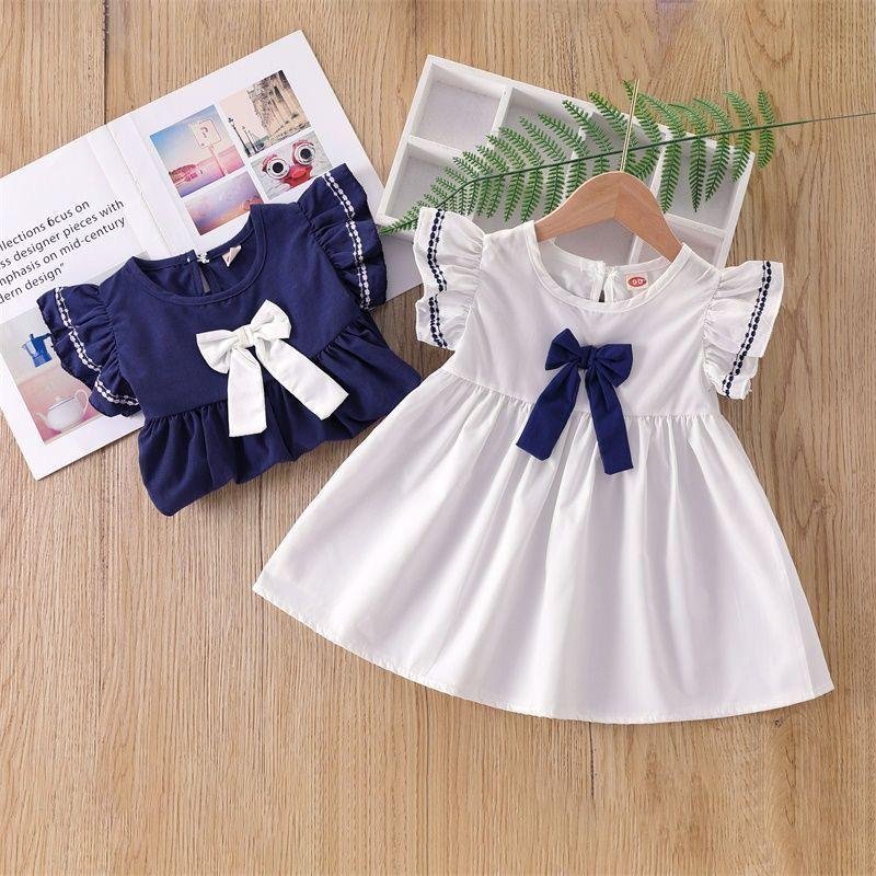 A classic navy A‑line dress with cute flutter sleeves trimmed in white lace and a big ivory bow at the chest. Simple, elegant, and comfy—perfect for birthdays, family outings, or any day you want your little one to look extra special.