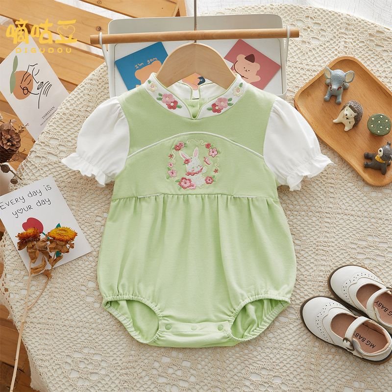 This adorable mint-green romper features soft puff sleeves and a delicate embroidered bunny surrounded by tiny floral details πΈπ. Designed with a gentle Mandarin-style neckline and snap-button closure at the bottom for easy diaper changes. Made from soft, breathable fabric to keep your little one comfy all day. Perfect for playtime, outings, or cute photos