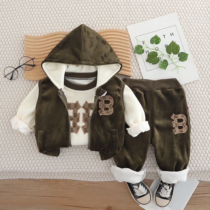 This stylish kids’ winter co-ord set features a soft olive-green hooded vest paired with matching jogger pants for a warm and trendy look. Made from plush, velvety fabric, it offers extra comfort and coziness for cooler days. The set includes a contrasting inner top and is highlighted with a bold embroidered letter detail, adding a sporty touch. With elasticated cuffs and an easy fit, this outfit is perfect for everyday wear, outings, or travel—keeping your little one comfortable and effortlessly stylish.