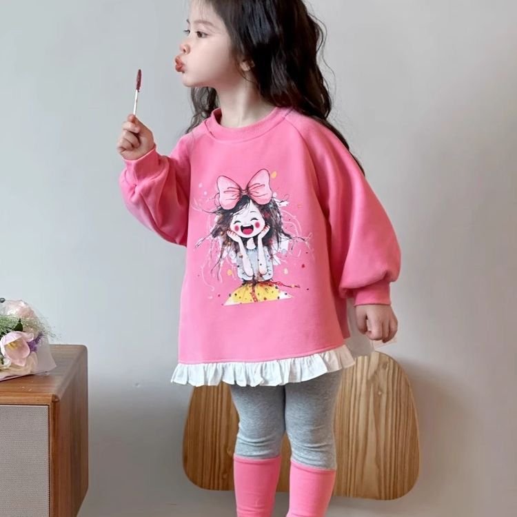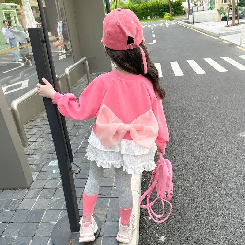 A stylish little girl dressed in a vibrant pink sweatshirt featuring a playful character print on the front and a charming oversized bow detail at the back. Paired with soft grey leggings, matching pink socks, and sporty sneakers, this look blends comfort with eye-catching style. the outfit is perfect for casual outings, playdates, and everyday adventures with a fun, fashionable twist.