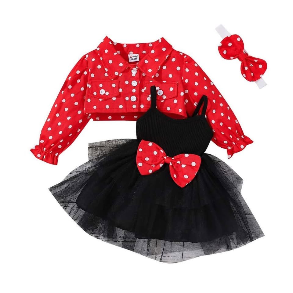 A playful three-piece ensemble featuring a vibrant red long-sleeve cropped jacket adorned with classic white polka dots, finished with front buttons and a sweet rounded collar for a retro-inspired touch. Layered beneath is a chic black sleeveless dress with a fitted ribbed bodice and a voluminous layered tulle skirt that adds dramatic flair. A statement red polka dot bow sits at the waist, perfectly coordinating with the jacket. The look is completed with a matching red polka dot bow headband, creating an irresistibly cute, character-inspired party outfit—perfect for birthdays, celebrations, and magical dress-up moments.