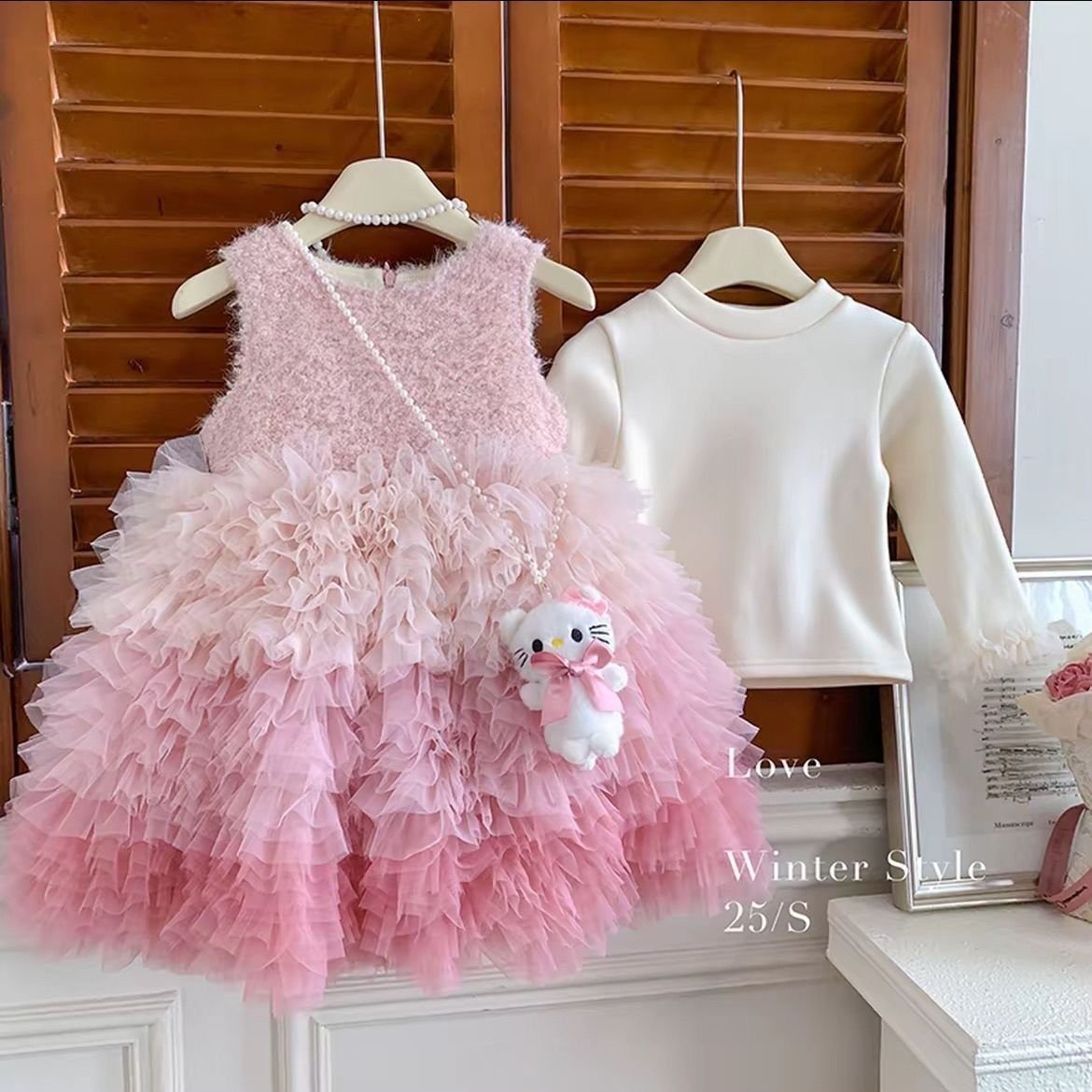 Turn every moment into a fairytale with this elegant baby girl princess dress set. Designed with a fluffy layered tulle skirt in soft blush pink and a cozy inner long-sleeve top, this outfit blends warmth with dreamy style. The textured bodice, delicate ruffle details, and adorable charm accessory add a luxurious touch, making it perfect for winter celebrations, birthdays, weddings, and photoshoots. Soft, skin-friendly fabrics ensure comfort while your little one shines like a princess.