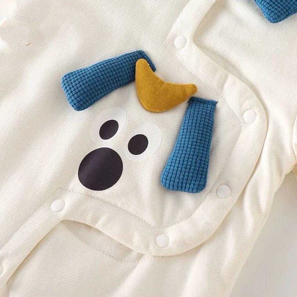 Dress your little one in effortless charm with this soft and stylish romper. Designed in a crisp white shade with a contrasting blue collar and sleeve trims, this romper features an adorable puppy face detail that adds a playful, lovable touch.