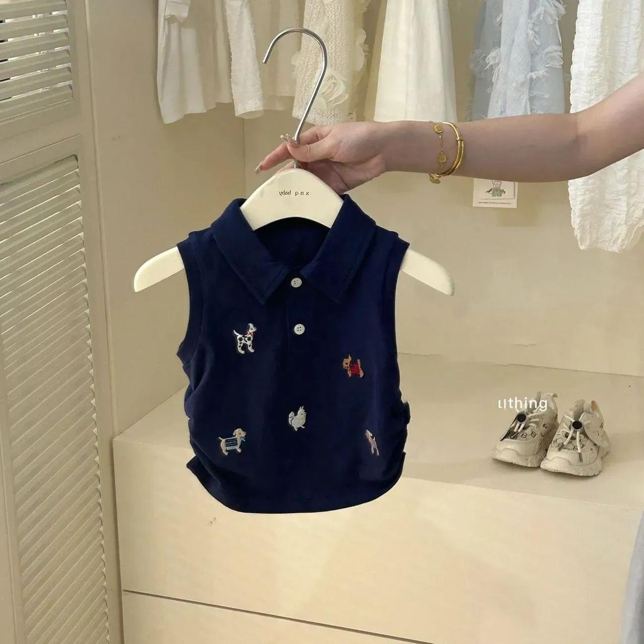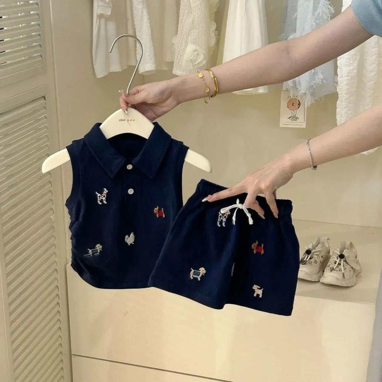 A navy sleeveless polo top paired with matching shorts, both sprinkled with tiny colorful puppy embroideries. The comfy elastic waist and soft cotton feel make this set perfect for your little one’s playtime, outings, and everyday sporty‑cute looks.