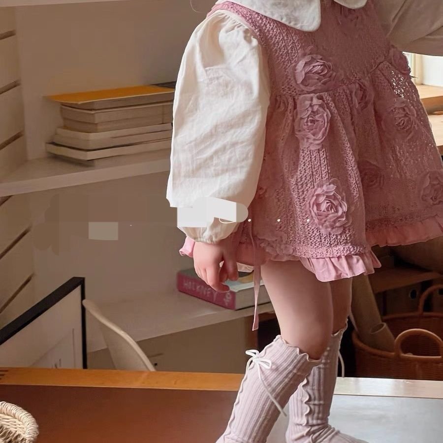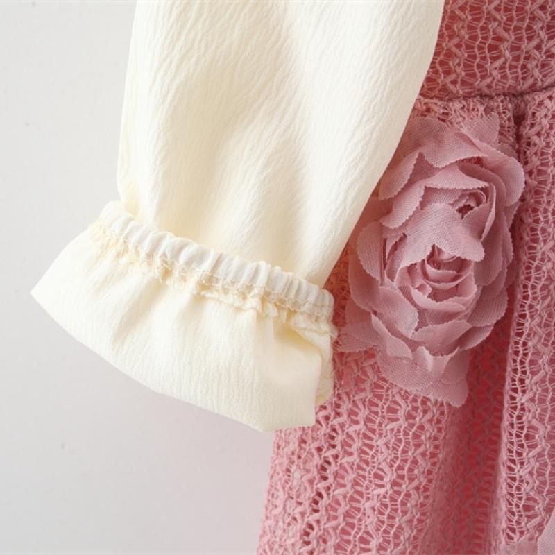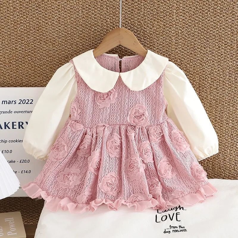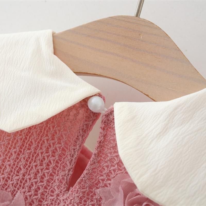 A dreamy and elegant dress made for your little angel This beautiful outfit features a soft pink textured fabric adorned with delicate 3D rose details, paired with classy full sleeves and a charming white Peter Pan collar. The flared silhouette with a gentle ruffle hem adds extra sweetness, making it perfect for birthdays, parties, and special occasions. Comfortable, graceful, and absolutely picture-perfect