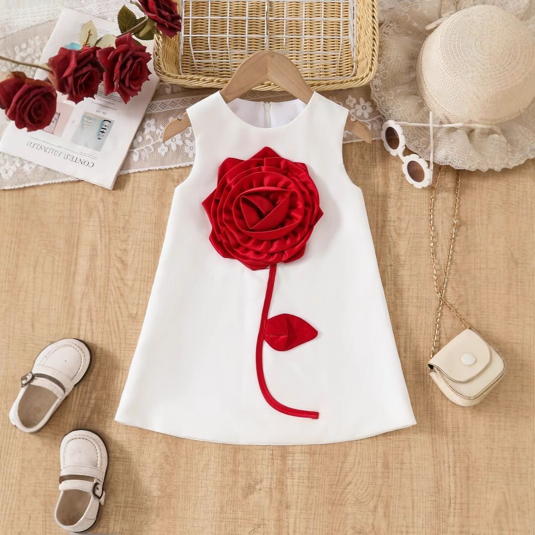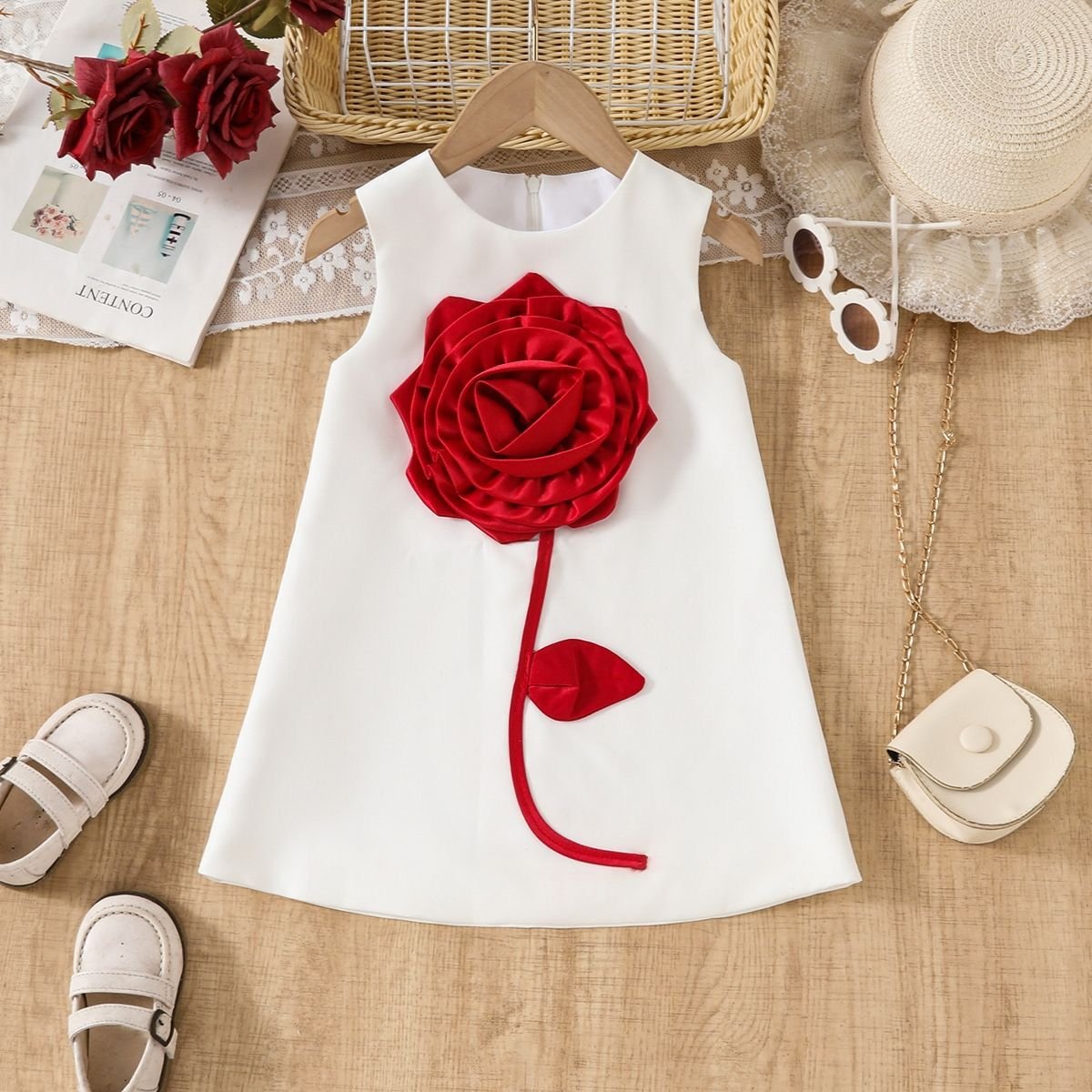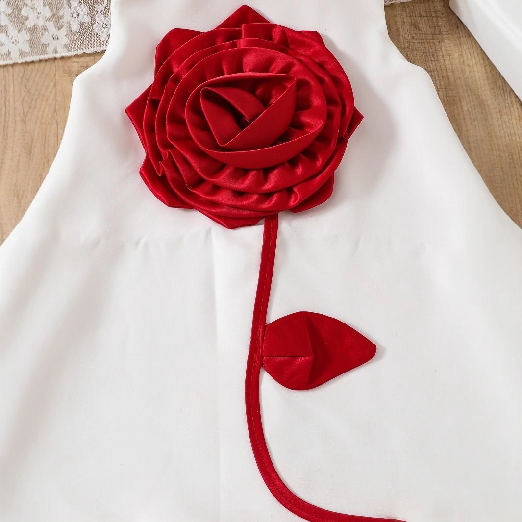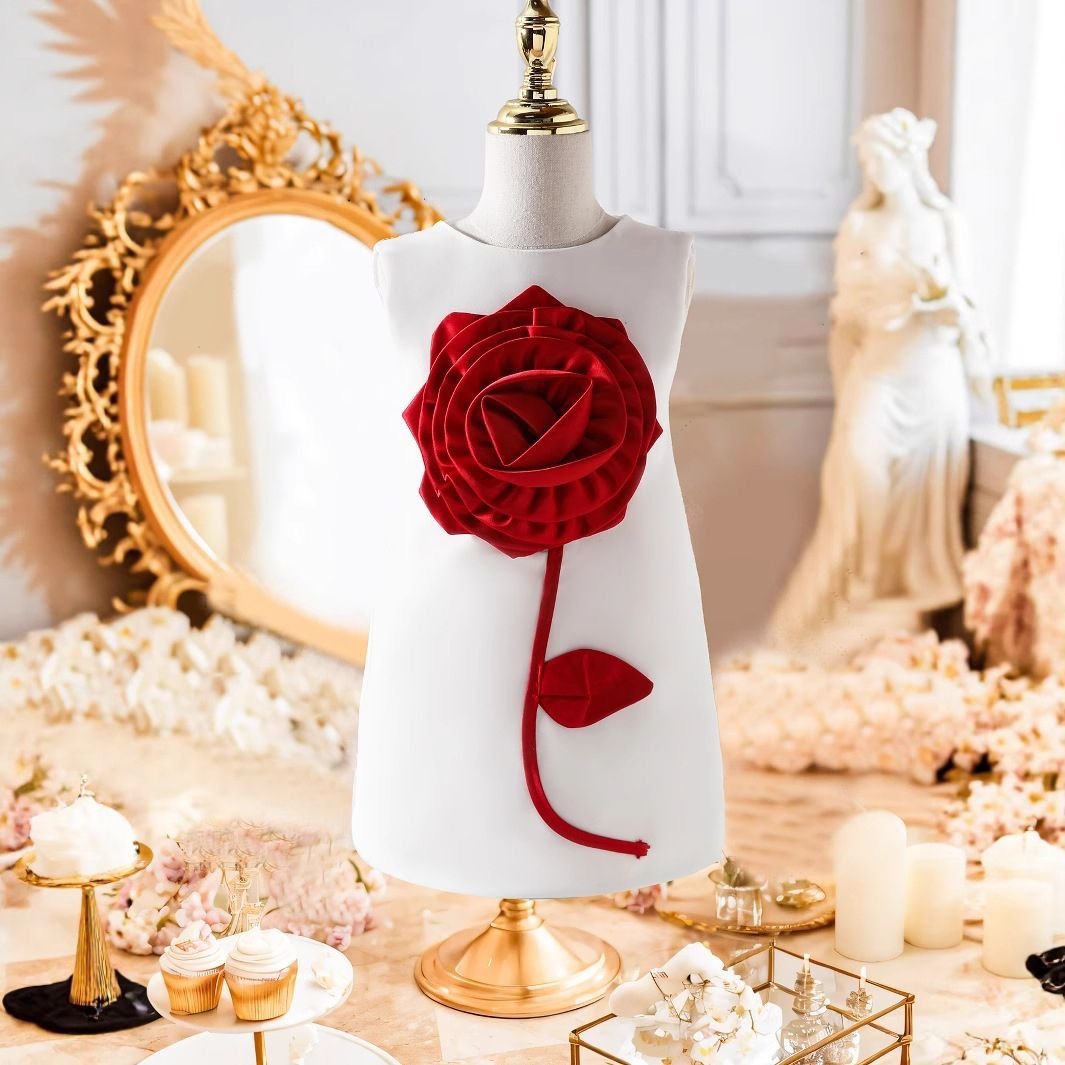 A stunning sleeveless A-line dress in a crisp ivory tone, designed with a clean, structured silhouette that allows its bold detail to shine. The centerpiece is an oversized three-dimensional scarlet red rose applique blooming across the bodice, complete with layered satin petals for a rich, sculpted effect. A matching red stem and single leaf extend gracefully downward, creating an artistic, couture-inspired finish. The smooth fabric and minimalist cut balance the dramatic floral accent, making this dress a striking choice for special occasions, celebrations, and unforgettable photo moments.