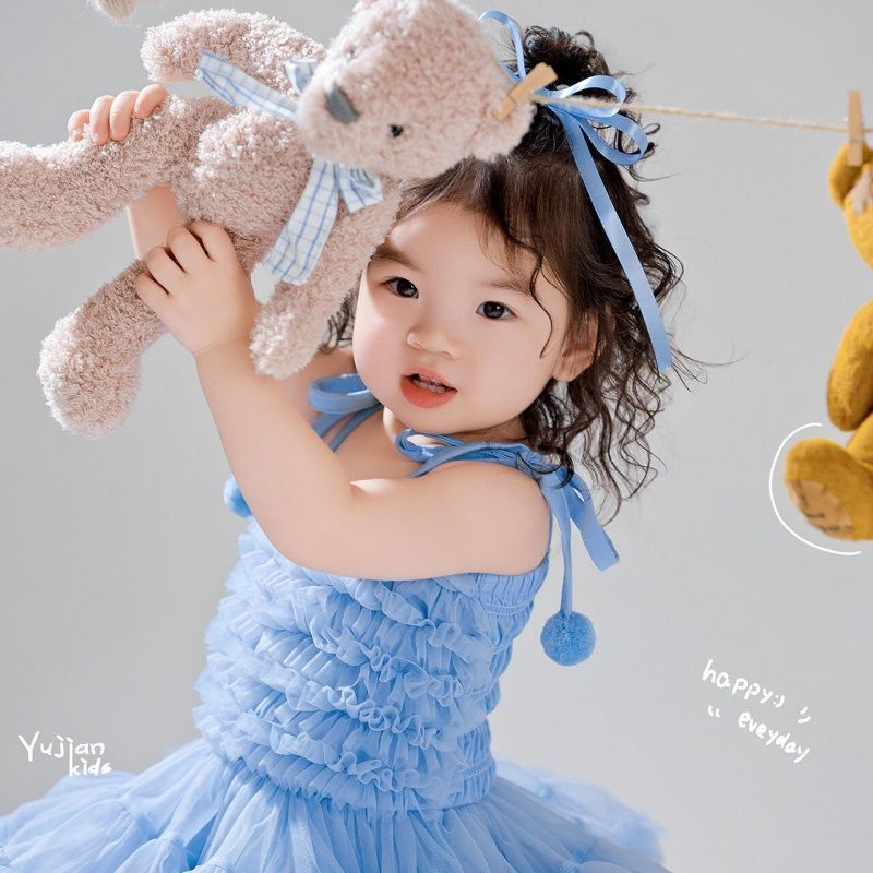 This elegant sky-blue dress features a soft layered tulle design that creates a fluffy, princess-style silhouette. The bodice is decorated with delicate gathered ruffles for a textured look, while the skirt flows into multiple airy tulle layers that add volume and movement. Adjustable shoulder straps tied into ribbon bows with small pom-pom accents give the dress a sweet finishing touch, making it perfect for parties, photoshoots, or special occasions.