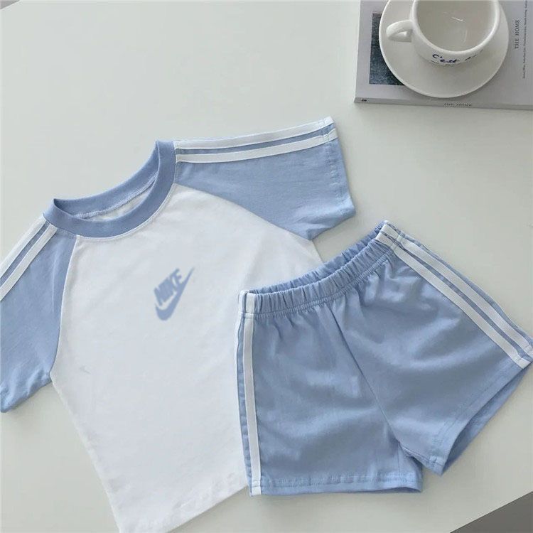 This casual sporty two-piece set features a white raglan T-shirt with soft sky-blue sleeves and matching ribbed neckline accents. The front of the shirt includes a minimal athletic-style logo, giving it a clean, relaxed streetwear look. Paired with the top are coordinating sky-blue elastic-waist shorts designed for comfort and easy movement, finished with white double side stripes for a classic athletic touch. The lightweight fabric and breathable fit make this set ideal for everyday wear, playtime, or summer outings while keeping a neat, sporty style.