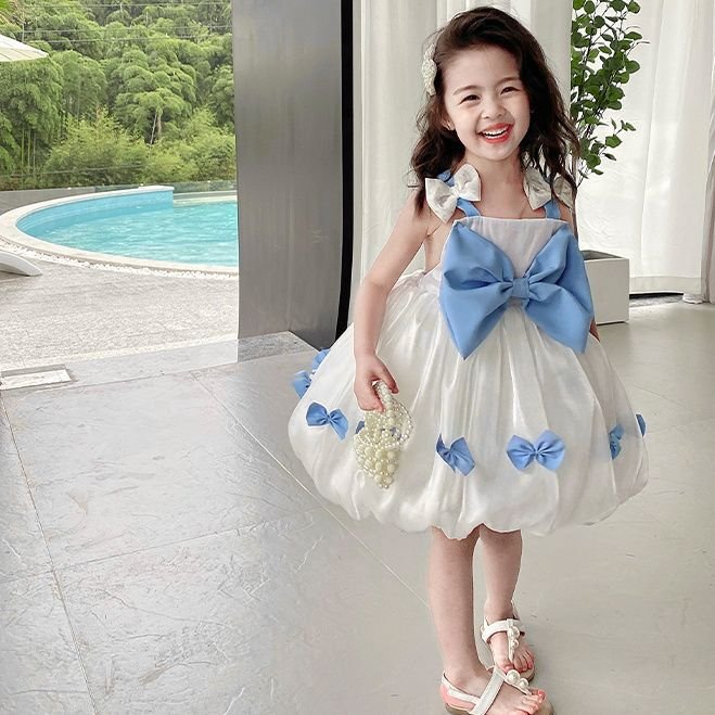 A dreamy party dress in a soft ivory satin finish, designed with a voluminous bubble silhouette that creates a playful yet elegant shape. The bodice features delicate shoulder straps accented with charming bow details, while a large statement sky-blue bow sits gracefully at the center front for a bold, princess-inspired touch. The skirt is adorned with scattered matching blue bow appliqués, adding sweetness and dimension throughout. Light, luminous, and full of charm, this dress is perfect for birthdays, celebrations, and magical twirl-worthy moments.