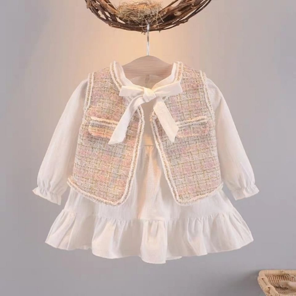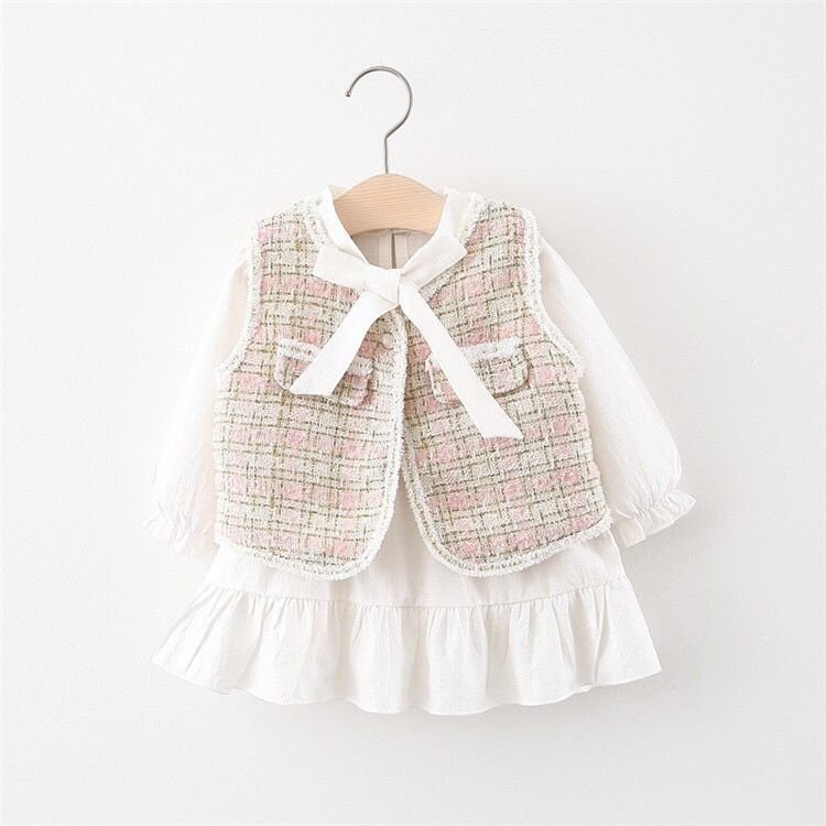 This outfit features a delicate white long-sleeve dress with sheer, lightly puffed sleeves and a softly ruffled hem for an airy, elegant feel. Layered over it is a pastel tweed-style vest in soft pink and cream tones, trimmed neatly and finished with a sweet white ribbon bow at the front. The textures and gentle colors give the look a refined, vintage-inspired charm—perfect for special occasions, portraits, or a classic, dressed-up moment.