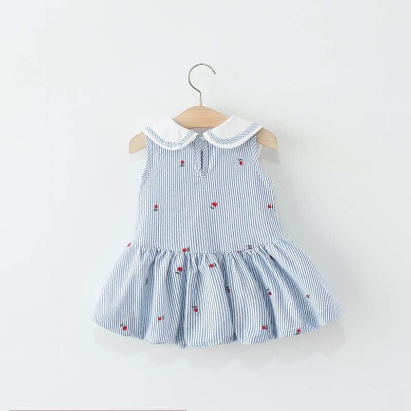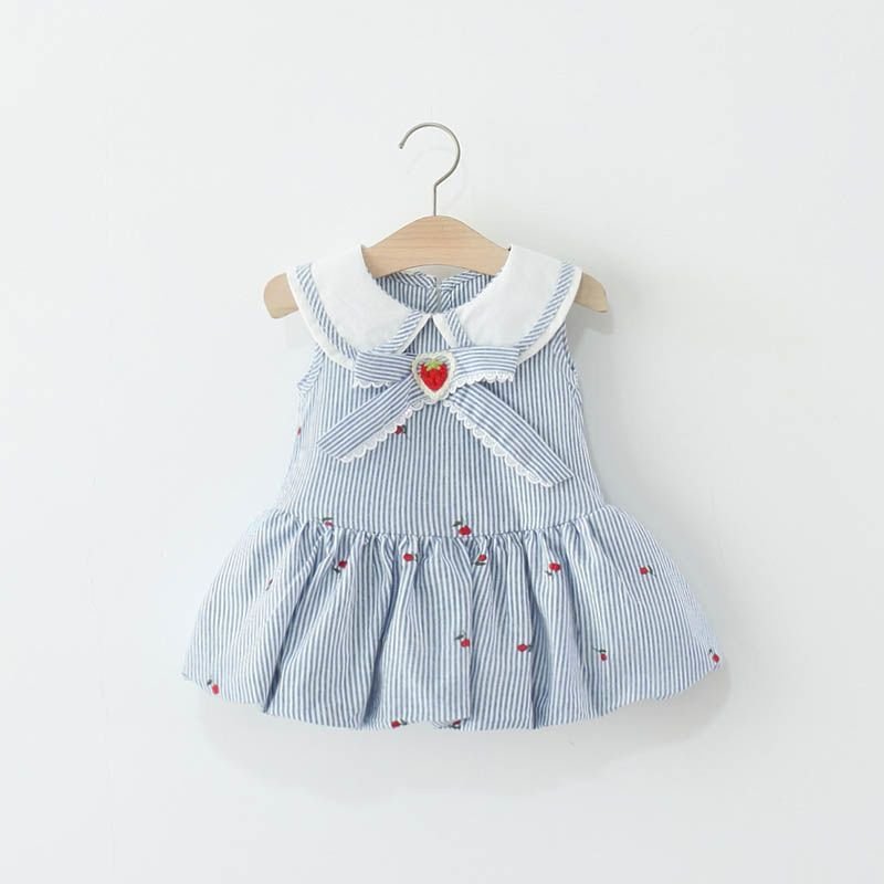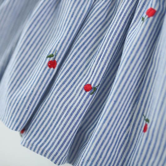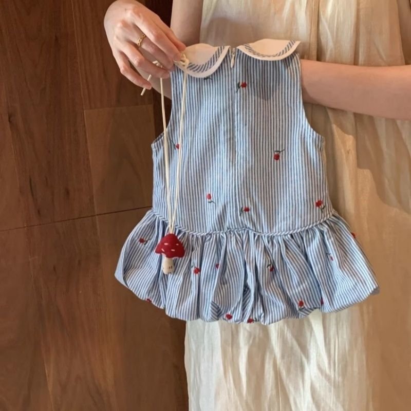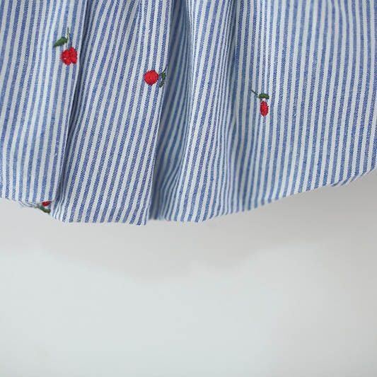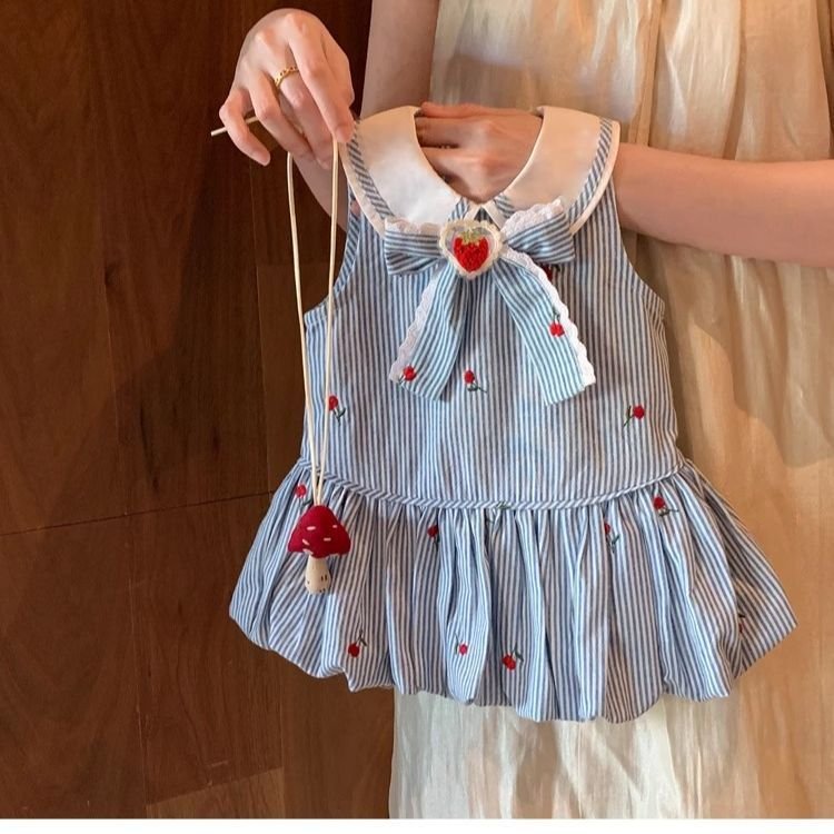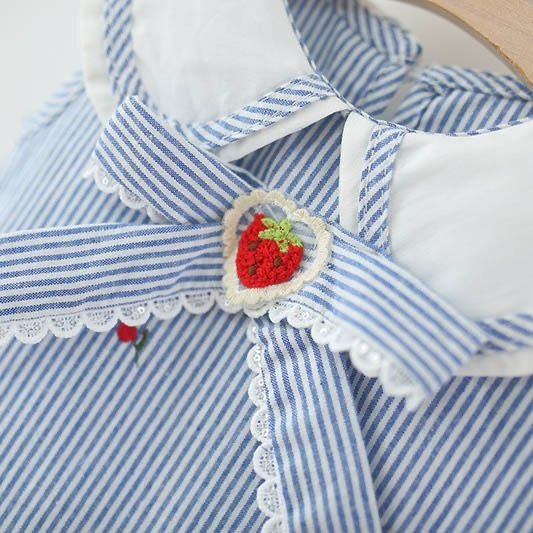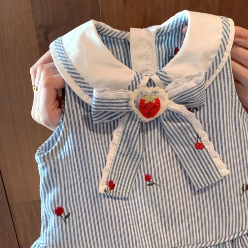 A sweet sleeveless dress designed in soft blue-and-white vertical stripes, giving it a fresh and breezy feel. The dress features a wide white sailor-style collar trimmed with delicate lace edging for a vintage-inspired touch. At the center sits a charming striped bow accented with a small strawberry applique, adding a playful pop of red. Tiny embroidered strawberries are scattered across the fabric, enhancing the whimsical detail. The gathered waist flows into a softly flared skirt, creating a light, airy silhouette perfect for sunny days and picture-perfect moments.