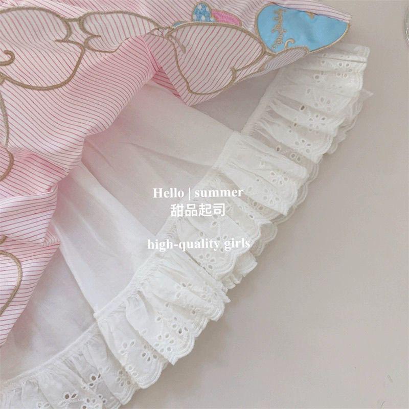 The lower front features whimsical embroidered details: gold-outlined hearts trailing across the skirt, culminating in a large, appliquéd blue bow adorned with a cute My Melody character wearing a polka-dot headband. The entire look rests on a scalloped lace underskirt peeking from below, enhancing its fairy-tale aesthetic.