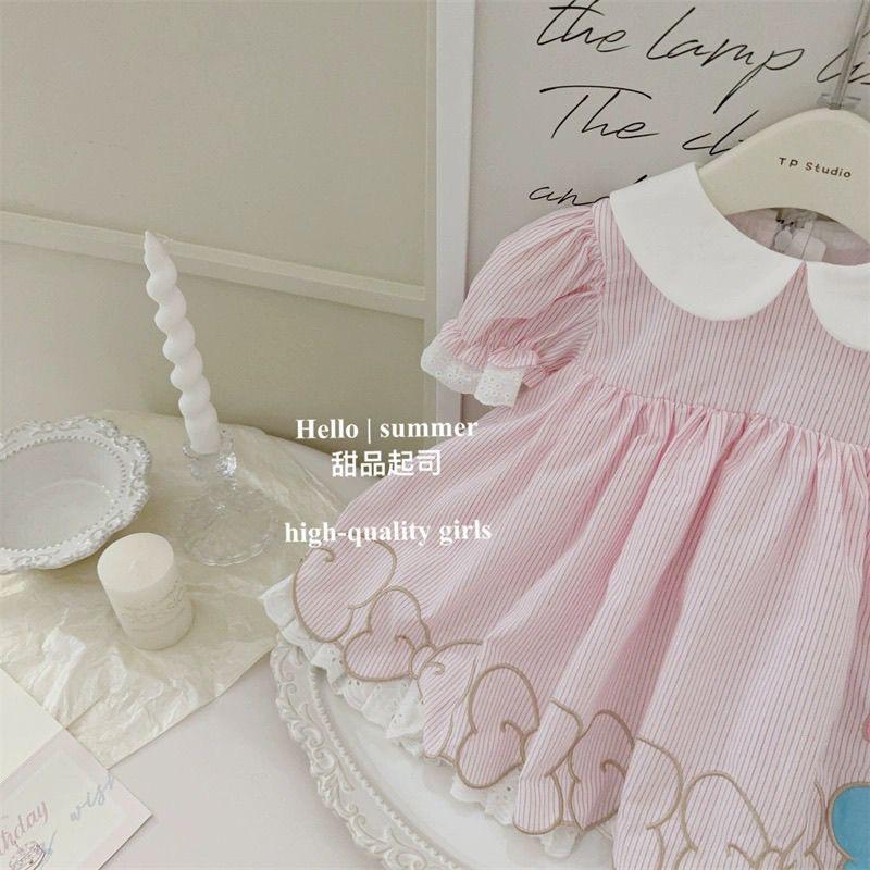 A sweet, pastel-pink seersucker dress with vertical micro-stripes that give it a soft, textured bounce. The centerpiece is the oversized, crisp white Peter Pan collar — rounded and doll-like — framing the neckline like a storybook illustration. Puffed short sleeves end in delicate lace-trimmed ruffles, adding vintage charm without bulk. The bodice gently gathers at the waist into a full, A-line skirt that flares out over a layered petticoat (visible beneath the hem), creating a cloud-like silhouette.