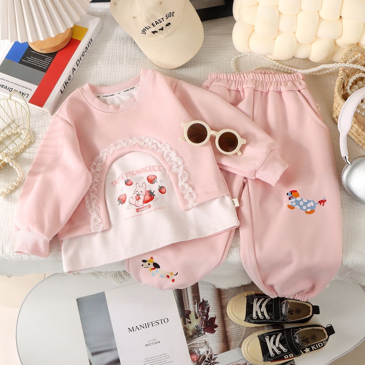 This adorable baby girls’ two-piece set features a soft pastel pink sweatshirt paired with comfy matching joggers. The top is highlighted with a cute strawberry bunny print and delicate lace detailing, adding a sweet, playful charm. Made from cozy, breathable fabric with a relaxed fit and elastic waistband, it’s perfect for everyday wear, playtime, or casual outings. A lovely blend of comfort and cuteness