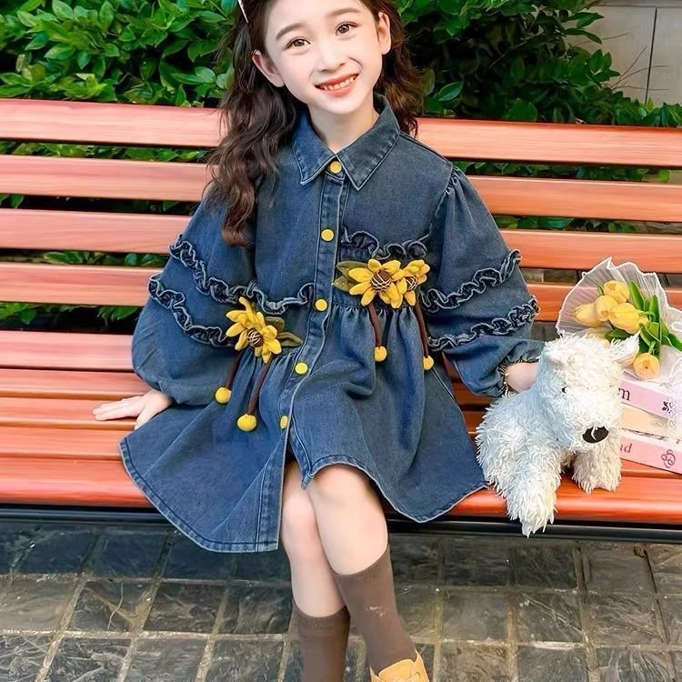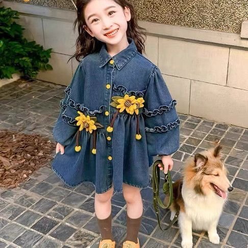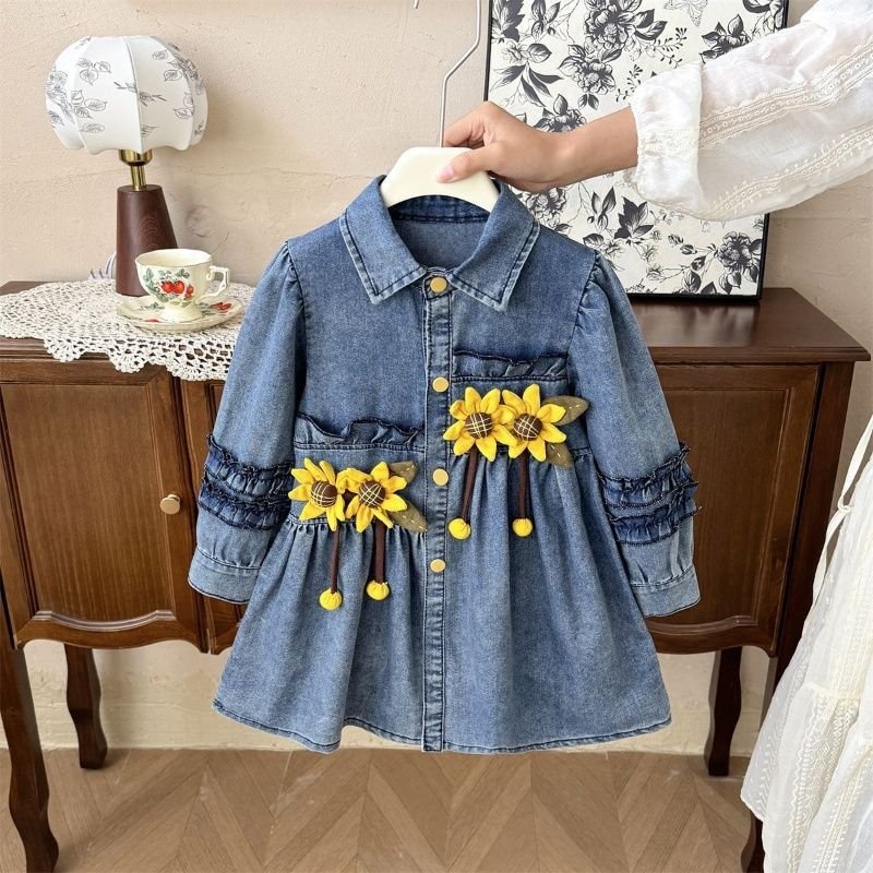 A sweet denim baby dress with a classic collared neckline and button-down front, designed in a soft A-line silhouette. The highlight is the pair of bright yellow sunflower appliqués on the chest, complete with dangling petal details that add playful movement. Ruffled stitching along the sleeves and bodice gives it a vintage-inspired touch, while the washed denim fabric keeps it comfy and everyday-wear friendly. Perfect for a cute casual outing with a sunny, cheerful vibe.