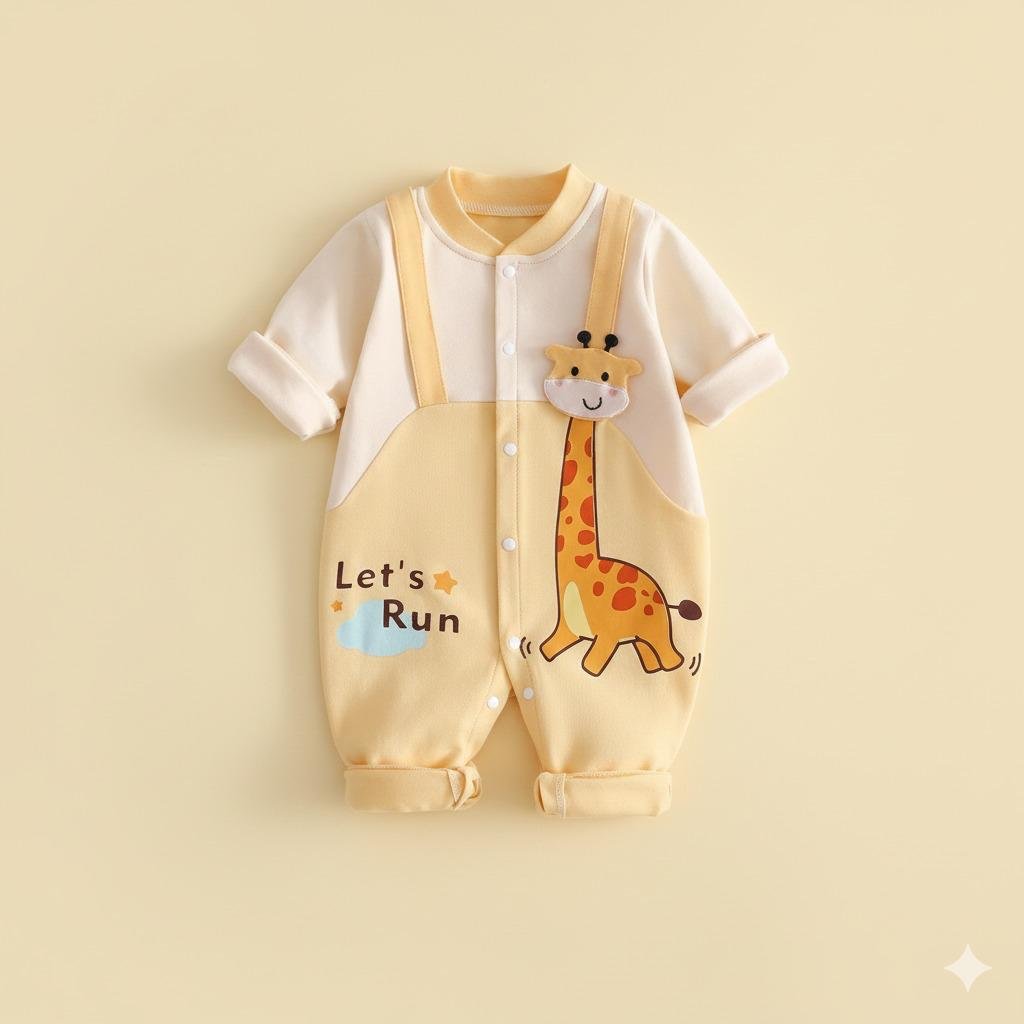This adorable baby romper features a soft pastel yellow and cream color palette with a playful giraffe print that adds instant charm. Designed with a cute dungaree-style look, it includes snap-button closures for easy dressing and rolled cuffs for a cozy fit. The cheerful “Let’s Run” text and smiling giraffe detail make it perfect for everyday wear, photoshoots, or gifting. Made from gentle, baby-friendly fabric, this romper keeps little ones comfortable while looking irresistibly cute.