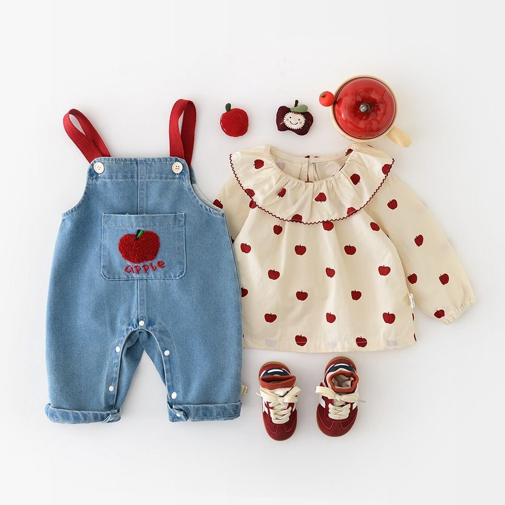 An adorable two-piece set featuring a soft cream long-sleeve blouse sprinkled with tiny red apple prints for a playful, autumn-inspired touch. The blouse is designed with a wide ruffled collar trimmed in delicate red piping, adding a charming vintage feel. Layered over it is a light-wash denim dungaree romper with a relaxed fit and rolled cuffs for a casual finish. The front pocket showcases a fuzzy red apple applique with embroidered “apple” lettering beneath, creating a cute focal detail. Snap closures along the legs ensure easy changes, making this set both practical and irresistibly sweet for everyday adventures.