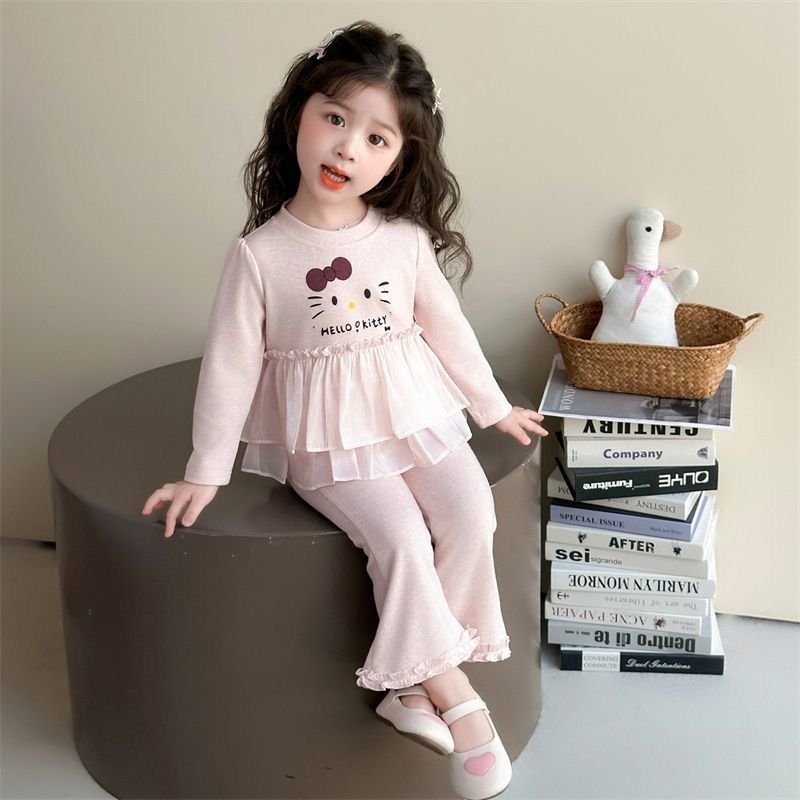 A soft and charming girls’ outfit in a gentle blush tone, perfect for comfort with a cute, stylish flair. The long-sleeve top features a classic Hello Kitty print on the chest, paired with layered sheer tulle ruffles at the hem that add a dress-like, playful elegance. Matched with slim-fit pants finished with delicate lace trim at the ankles, the set creates a balanced look of cozy and chic. Completed with simple Mary Jane shoes, this outfit is ideal for casual outings, playdates, or picture-perfect moments.