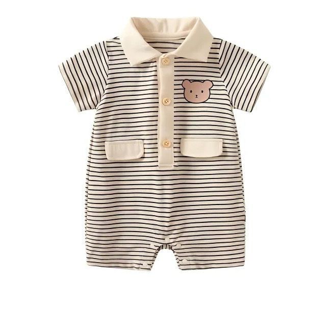 Classic stripes meet cuddly charm  This adorable romper features soft neutral stripes, a sweet teddy face detail, and a smart polo-style collar for a mini “dressed-up” look . Designed with comfy fabric and easy buttons, it’s perfect for everyday wear, outings, or special moments. Simple, stylish, and irresistibly cute—your little one will steal hearts all day long.